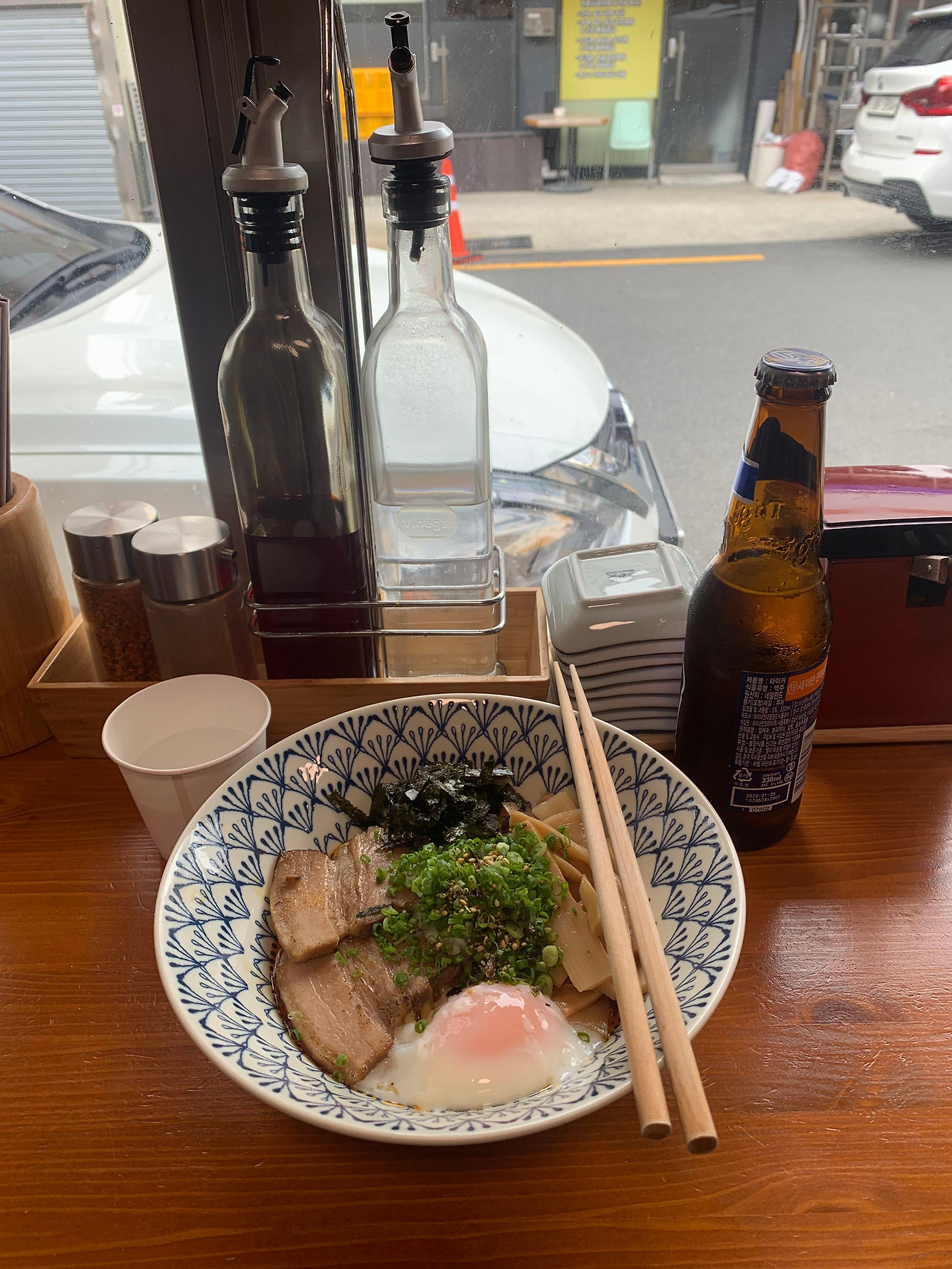 중국집의 기본은 짜장면이다. 역시 아부라 소바 가게의 기본은 아부라 소바라는 생각에 주문을 했다. 토핑으로 올리는 반숙이 기본으로 나왔다. 테이블에는 아부라 소바의 기본인 라유와 식초가 있었다. 나는 세프가 타이거 맥주 간판을 걸어 놓은 이유가 있을 거라는 믿음을 갖고, 타이거 맥주를 함께 주문하였다.