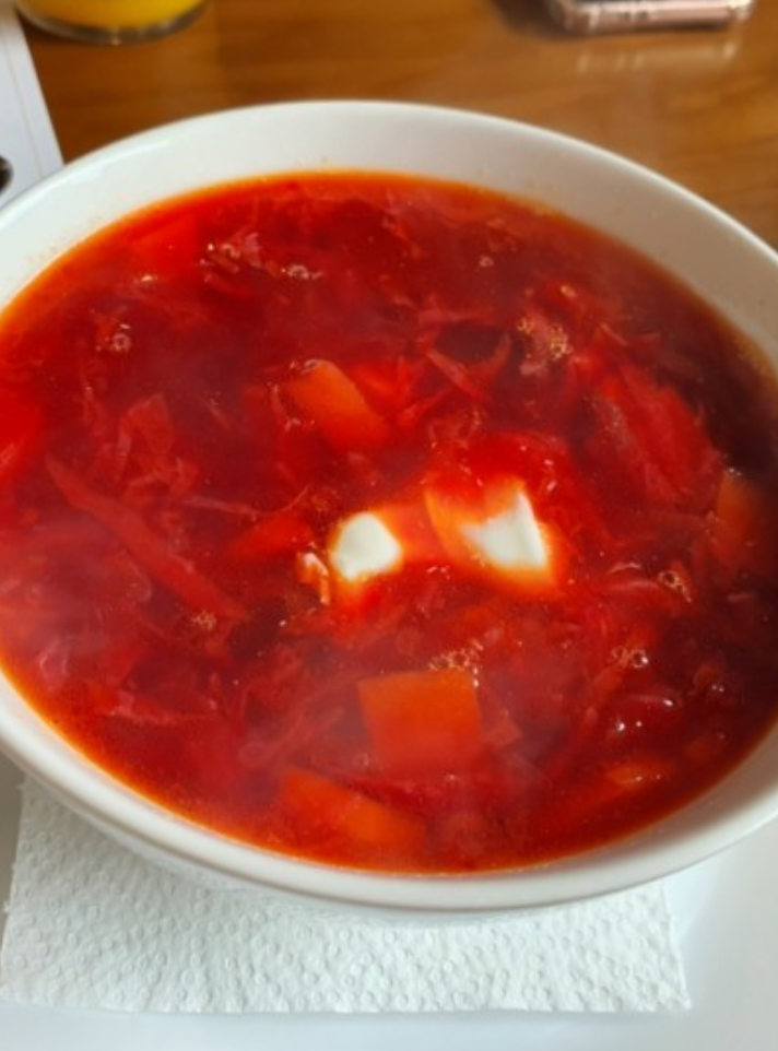 보르쉬의 따뜻한 국물에 고기와 각종 야채가 들어 있어 몸을 녹이기에 안성맞춤이었다. 토마토 스프 특유의 맛에 야채 단맛과 고기 국물 맛까지 우리 가족에겐 러시아 음식 맛을 제대로 느낄 수 있게 해 준 첫 끼니였다.