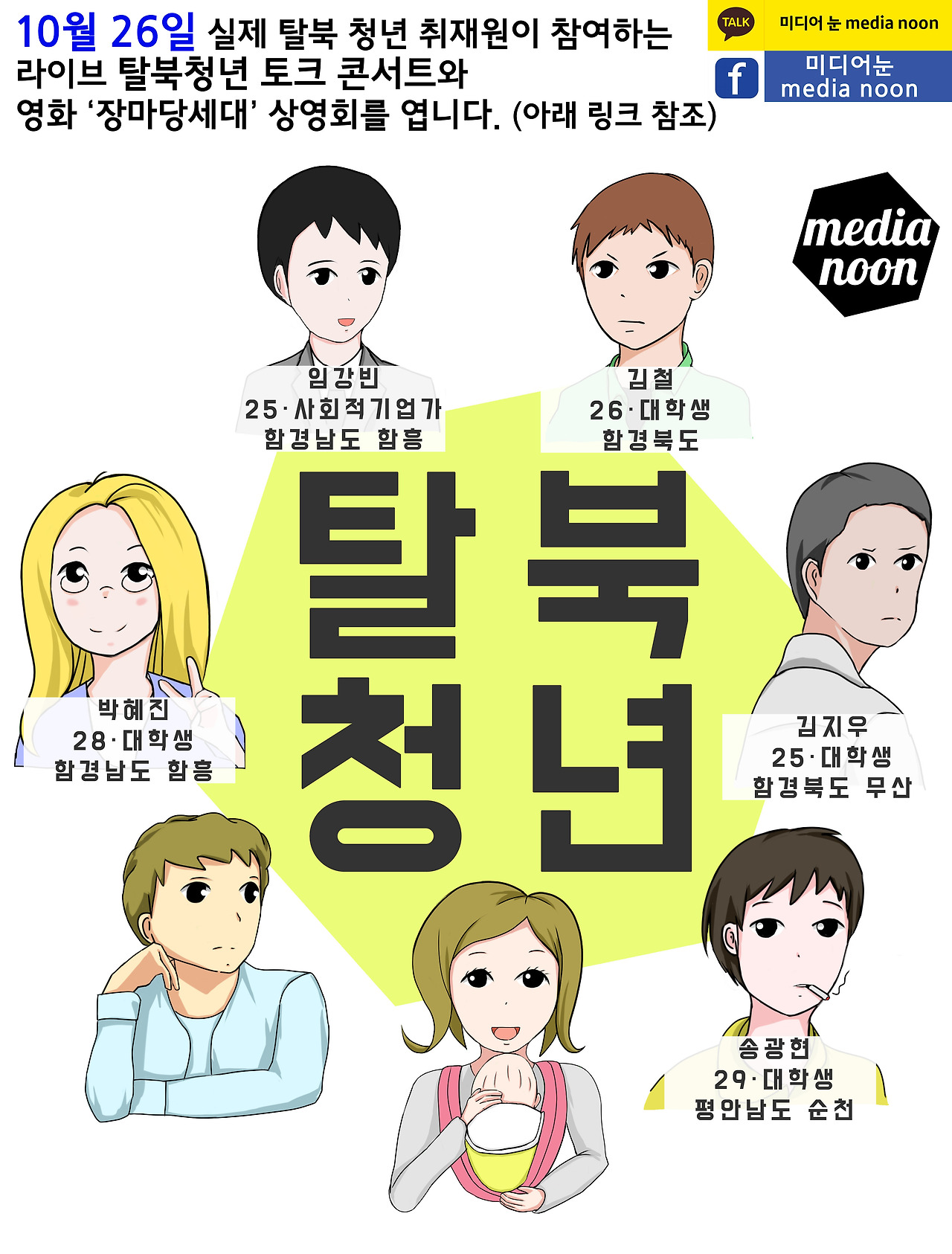 탈북청년 기획은 2030 탈북민 7인의 한국에서의 삶에 대한 이야기를 담았다. 국내 입국한 3만 명의 탈북자 중 대다수가 청년이다. 하지만 학교, 직장, 결혼. 어디를 가나 따라다니는 “탈북”이라는 꼬리표는 새로운 삶을 시작하는 청년들에게 큰 무게이다. 북한이라는 뿌리 없이 이들의 삶을 말할 수 없지만 이제는 탈북자라는 말보다는 보통의 청년들처럼 한국인 청년이라고 불리고 싶은 7인의 청년들을 만났다. 이들의 이야기로 우리의 새로운 이웃인 탈북 청년들의 고민을 함께 느끼며, 그들의 문제가 나의 문제, 더 나아가 우리 사회가 함께 고민하고 풀어야 하는 문제로 인식의 전환을 돕고자 한다.