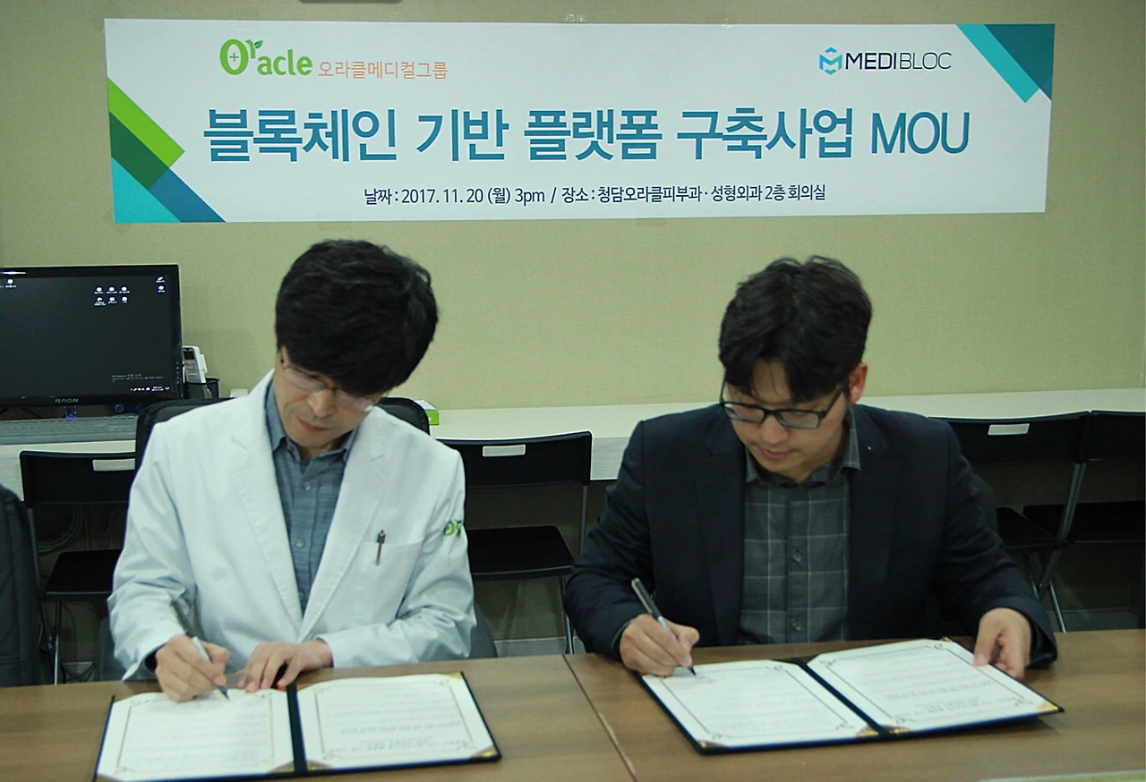 오라클메디컬그룹과 메디블록은 공동으로 블록체인 기반 개인건강기록 플랫폼 구축에 나서기로 하고 11월 20일 서울 강남구 청담동 청담 오라클피부과성형외과에서 MOU 체결식을 진행하였습니다.