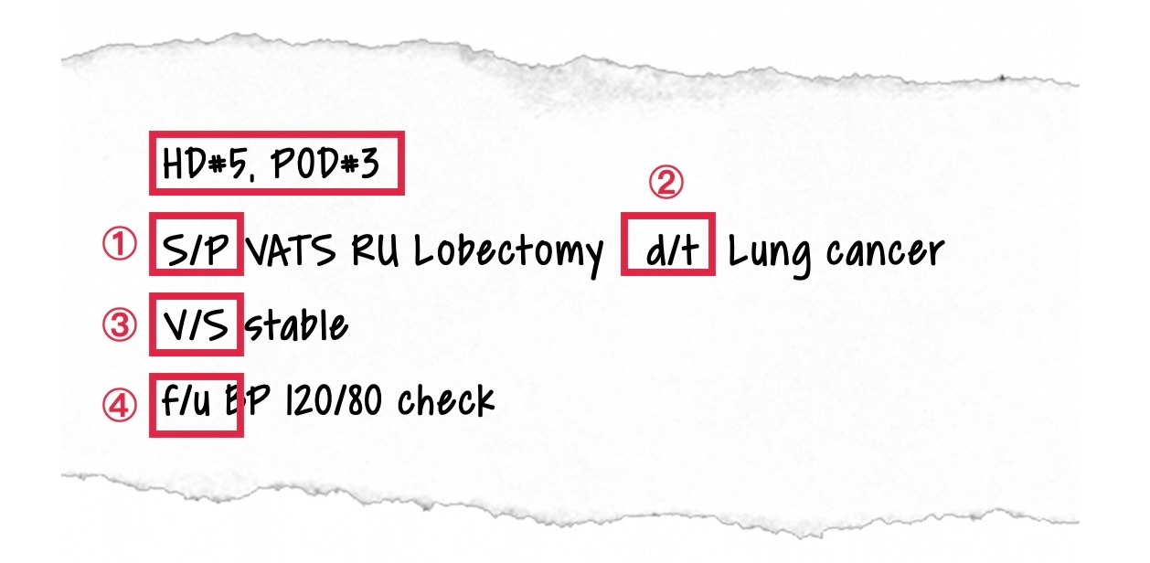 마지막으로 맨 위의 예시에 있는 HD, POD 역시 자주 사용되는 약어입니다. HD#5와 POD#3는, 각각 입원한 지 5일째와 수술한 지 3일째를 의미합니다. HD는 Hospital Day를, POD는 postoperative day, 즉 수술 후 날짜를 의미합니다. post는 후, operative는 수술을 의미하는 operation의 형용사 형태입니다. 대화 중에도 흔하게 사용되는데요, '이 환자는 금일 pod 2일째입니다.'라고 하면, 수술 후 이틀이 지난 환자라는 뜻입니다. 수술 당일은 빼고 다음날부터 1일째입니다. 수술(operation)은 줄여서 OP이라고 많이 사용합니다. OR은 operation room, 즉 수술실을 뜻합니다. 그럼, ER은 뭘까요? 예, emergency room, 즉 응급실이 됩니다.