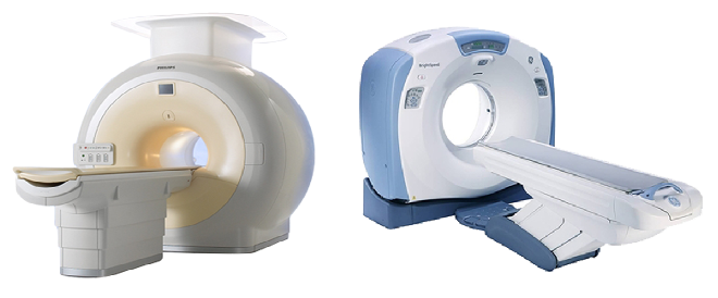 CT 스캔의 x-ray tube가 회전하는 모습(gfycat.com)CT는 기계 자체가 폐쇄감이 덜해서, 폐쇄공포증이 있는 사람에게도 적합합니다. 요즘 MRI는 개방감이 생겼는데, 오래전 MRI는 마치 세탁기 속으로 들어가는 것 같았습니다. 아래 그림에서 오른쪽의 도넛처럼 생긴 기구가 CT입니다. 왼쪽의 좀 더 두꺼운 기계가 MRI예요. 사진 설명에 tanning bed라고 했습니다.