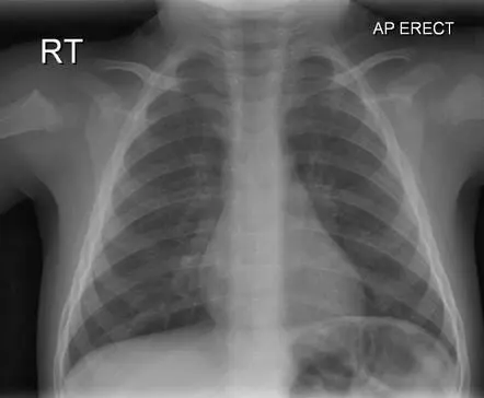 위는 흉부 엑스레이 사진인데요, 희게 나타난 뼈와, 공기가 가득 찬 폐를 관찰할 수 있습니다.
