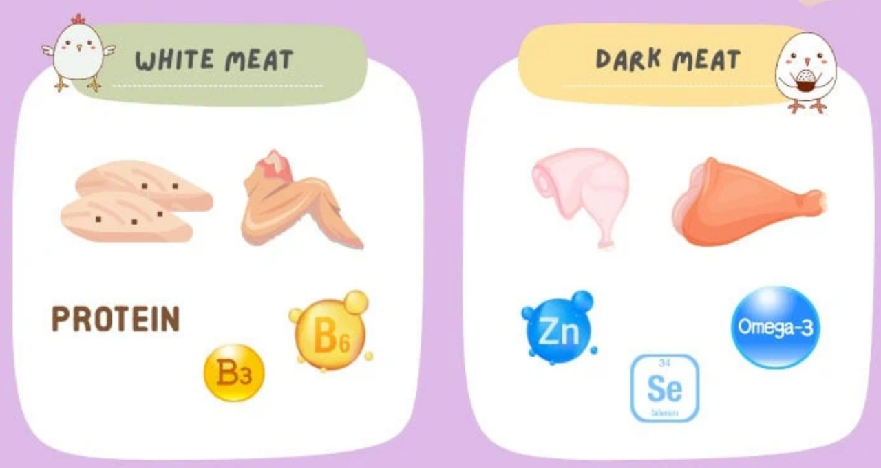 갈색살은 일반적으로 흰색 고기보다 더 많은 지방을 함유하고 있습니다. 왜냐하면, 갈색살의 유산소운동, 즉 지속적인 활동을 위해서는 추가적인 에너지가 필요하고, 이 에너지는 지방과 함께 저장되며 사용됩니다. 고기에 들어있는 더 많은 지방은 그 고기에 더 촉촉하고, 풍부한 맛을 부여하며, 약간 다르고, 종종 더 촉촉하다고 여겨지는 질감을 줍니다. 게다가 갈색살에 더 많이 함유된 철분(iron)과 아연(Zinc)은 고기에 금속적인 독특한 향취(gamey)를 만들어냅니다.
