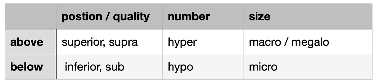 영어공부 하실 때 above, below, upper, on, beneath, 등등의 차이를 배우시던 기억이 날거예요. 의학용어는 훨신 간단해요. 일단 위, 아래를 뜻하는 말로 superior랑 inferior를 알아두세요. hyper, supra, hypo, sub도 비슷한데 약간 느낌은 다르지만 여러 단어에 다양하게 붙여서 사용합니다. 일단 느낌은 아래 표처럼 정리하시기 바랍니다.