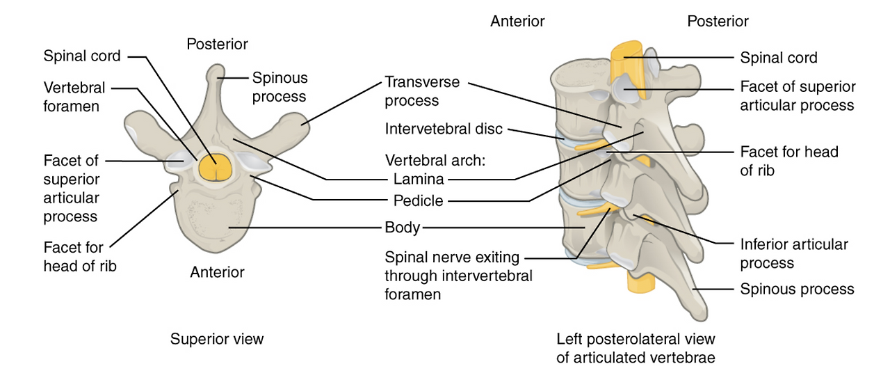 우리 어깨뼈를 보면 날개뼈라고 하죠? 삼각형 모양의 뼈가 있어요. 이 뼈는 어깨라는 뜻의 scapular라고 해요. 이 scapular라는 뼈에는 가운데 돌기가 있어요. 의학 용어에서는 튀나온 것을 이르는 말이 엄청 많아요. 이중에 spine이란 말이 있습니다. 라틴어의 spina가 ‘thorn, prickle, backbone’ 이란 뜻이거든요. 이 가운데 튀나온 부분을 scapular spine 이라고 합니다. 어깨 뼈의 가시 돌기란 뜻입니다. 허리 뼈에서도, 등의 한가운데서 만져지는 울퉁 불퉁한 뼈를 ‘가시처럼 튀나온 돌기spinous process(가운데 그림)’라고 해요. process는 돌기, spinous는 가시처럼 나왔다는 모양을 이야기 합니다.