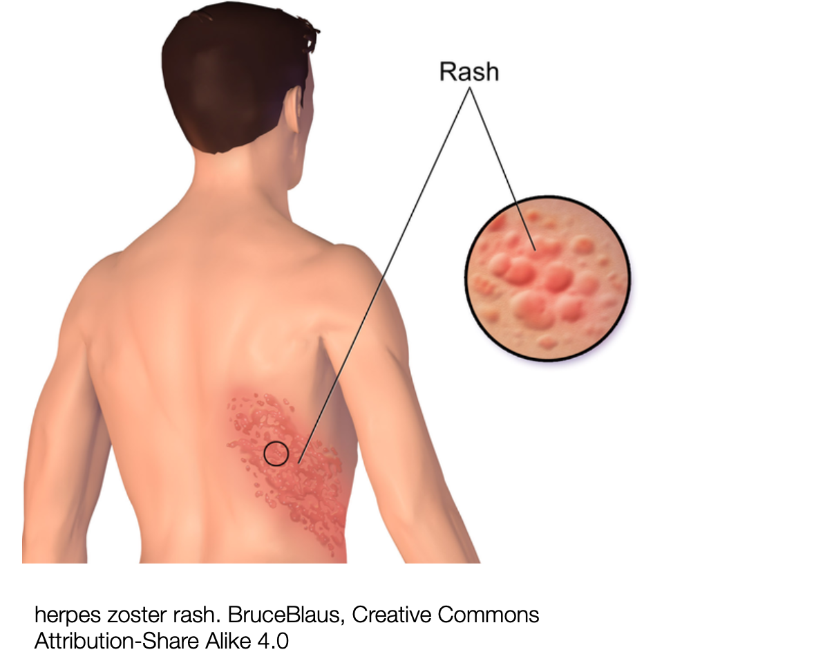 또, 헤르페스(herpes)가 들어간 의학용어로 대상포진이 있습니다. 일상용어로는 shingles라고 하고, 의학용어로는 herbpes zoster라고 해요. 수두 바이러스(Varicella zoster virus)가 척추 신경에 숨어(herpes) 있다가, 띠모양의 피부병변(그림)을 일으키는 질환입니다. zoster는 거들이나 코르셋을 뜻하는 그리스어로, 대상 포진이 발생하는 모양 때문에 붙은 이름입니다. 마치 코르셋을 입은 것처럼 띠 모양으로 옆구리에 흔하게 생기거든요. 하지만, 신체의 다른 부위에도 생길 수 있습니다.