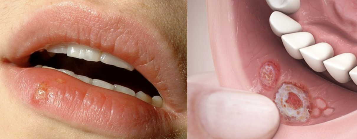왼쪽 그림은 구순 단순 포진(cold sore)이라고 하는 입술에 물집이 잡히는 질환이고, 오른쪽 그림은 우리가 아프타 구내염(canker sore)이라고 부르는 구내 궤양입니다. cold sore는 입술 외측, 위아래 입술이 만나는 곳에, canker sore는 주로 입술 안쪽에 생깁니다. cold sore는 바이러스 질환으로 키스 등의 접촉으로 전염될 수도 있지만, canker sore는 전염이 되지 않습니다.