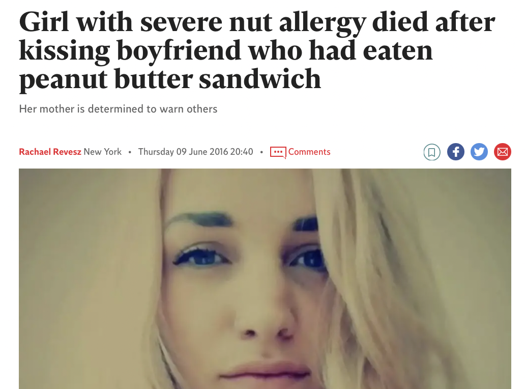 2012년 몬트리올에서 Myriam Ducré-Lemay라는 20대 여성은 파티를 앞두고 갑작스럽게 사망합니다. 평소 건강하던 젊은 여성의 죽음은 정말 미스터리 했는데요, 사망의 원인은 남자 친구와의 키스로 밝혀졌습니다. 남자 친구가 점심으로 먹었던 피넛 버터 샌드위치의 땅콩 성분이 이 여성에게 아나필락틱 쇼크(Anaphylactic shock)를 유발하였습니다. 아나필락틱 쇼크, 혹은 아나필락시스(Anaphylaxis)는 급격하고 심한 알레르기 반응으로 혀, 목젖이 부어오르고, 목이 부으면서 호흡을 하기 어려워져 호흡곤란으로 사망할 수 있습니다. 이 여성의 비극적인 죽음은 정말 소량의 땅콩 성분이 일으킨 알레르기 반응이었던 거죠.