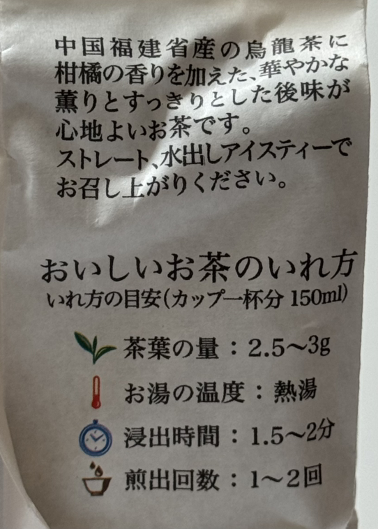 츄고쿠 푸캰쇼우산 노 우롱챠 니 칸키츠 노 카오리 오 쿠와에타, 하나야카나 카오리 토 슷키리토 시타 아토아지가 코코치요이 오챠 데스. 스트레이트, 미즈다시 아이스티 데 오메시아가리 쿠다사이.
