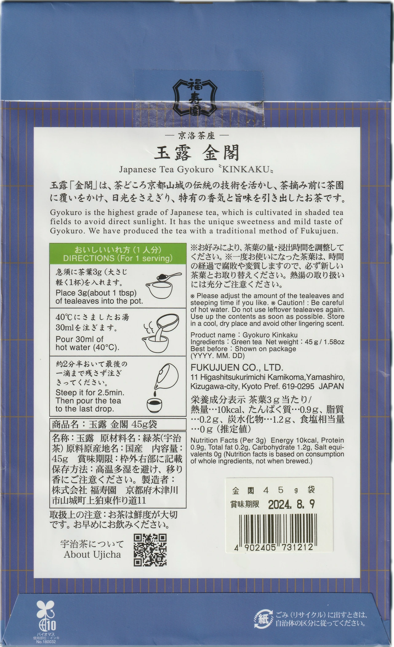 교쿠로는 새순이 나면 차광을 해서 빛을 좀 가려주고 키워 더 부드럽고 떫거나 쓴맛이 적어지며 무엇보다도 차의 감칠맛을 끌어올린 특징이 있는 차라고 하겠다. 교쿠로 하면 차광재배가 출제된다구요, 다들 체크. 아무튼 일본 센차중에선 가장 맛있다고 하는 차가 교쿠로이고 그런 만큼 다른 차들에 비해 가격도 많이 나가는 게 사실이다. 뭐 그만큼 프리미엄이라는 소리. 킨카쿠도 다른 후쿠주엔의 차와 마찬가지로 50g대의 포장은 이렇게 두꺼운 종이봉투 패키지에 은박 지퍼백이 들어있는 식이다. 디자인은 다른 센차들과 거의 동일한 패키지 디자인이고 테마 색이 보라색이라는 것 정도가 차이. 뒷면에는 레시피가 적혀있는데 차 1g당 물의 비율이 10ml다. 투차량 1:10이라는 건 꽤나 극단적인 비율인데 여기에 온도도 약 40도의 저온으로 2.5분을 우리라고 되어있다. 녹차를 2.5분 우린다는 건 좀 이상하게 보일 순 있지만 믿고 따라 해보면 일본 티룸에서 마셨던 그 일본차의 맛이 그대로 나오니 믿고 따라가 보자. 사실 많은 투차량과 저온 장시간의 우림법이 교쿠로의 특징인 건지 다른 대부분의 교쿠로 레시피가 정도의 차이는 있어도 저온장시간의 기조는 비슷하다.