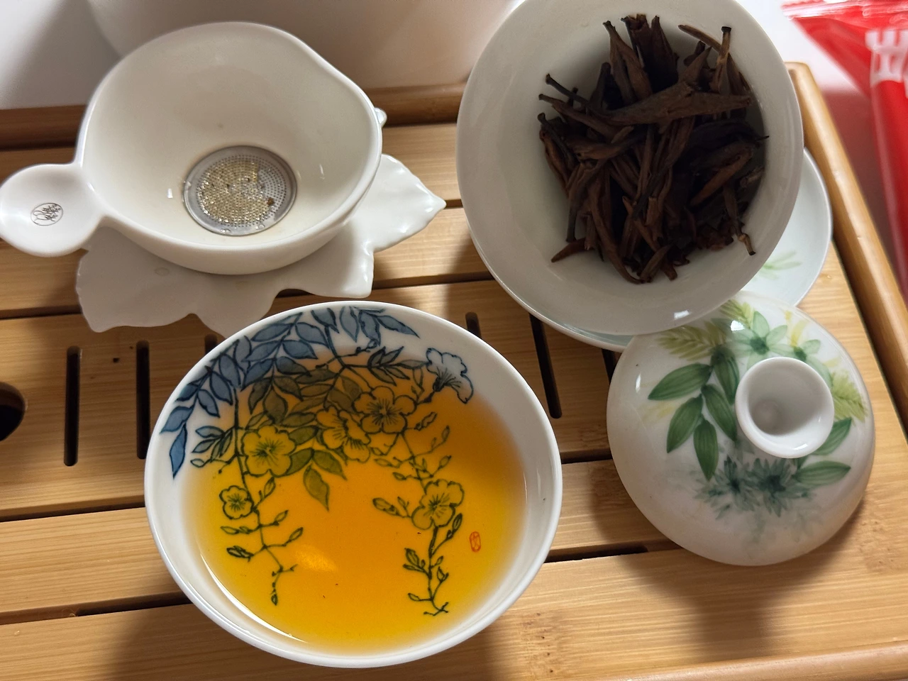 투차량은 계량하지 않고 대충 때려 넣었다. 원래 들어가면 한 그릇인 거다. 물은 약 90도, 60ml쯤. 너무 오래 우리지 않고 20초쯤 우렸다. 15초에 서 끊으려고 했는데 살짝 놓친 타이밍. 이날 오후에 이미 전홍을 어디선가 마시고 온 터라 의도치 않게 비교시음이 되었는데 다른 전홍과 비교해 보아도 전홍 특유의 군고구마향과 단맛이 은은하게 깔리는 느낌이었다. 그 외에도 쇠맛 같은 특이한 아로마가 있었는데 1,2포에서만 느껴진 걸로 봐선 세차하면 사라지는 맛이 섞여있는 듯하다. 세차를 한번 할걸 싶었던 게 내포성이 말도 못 한다. 8번인가 9번 마시다가 더는 안 되겠어서 냉침행.