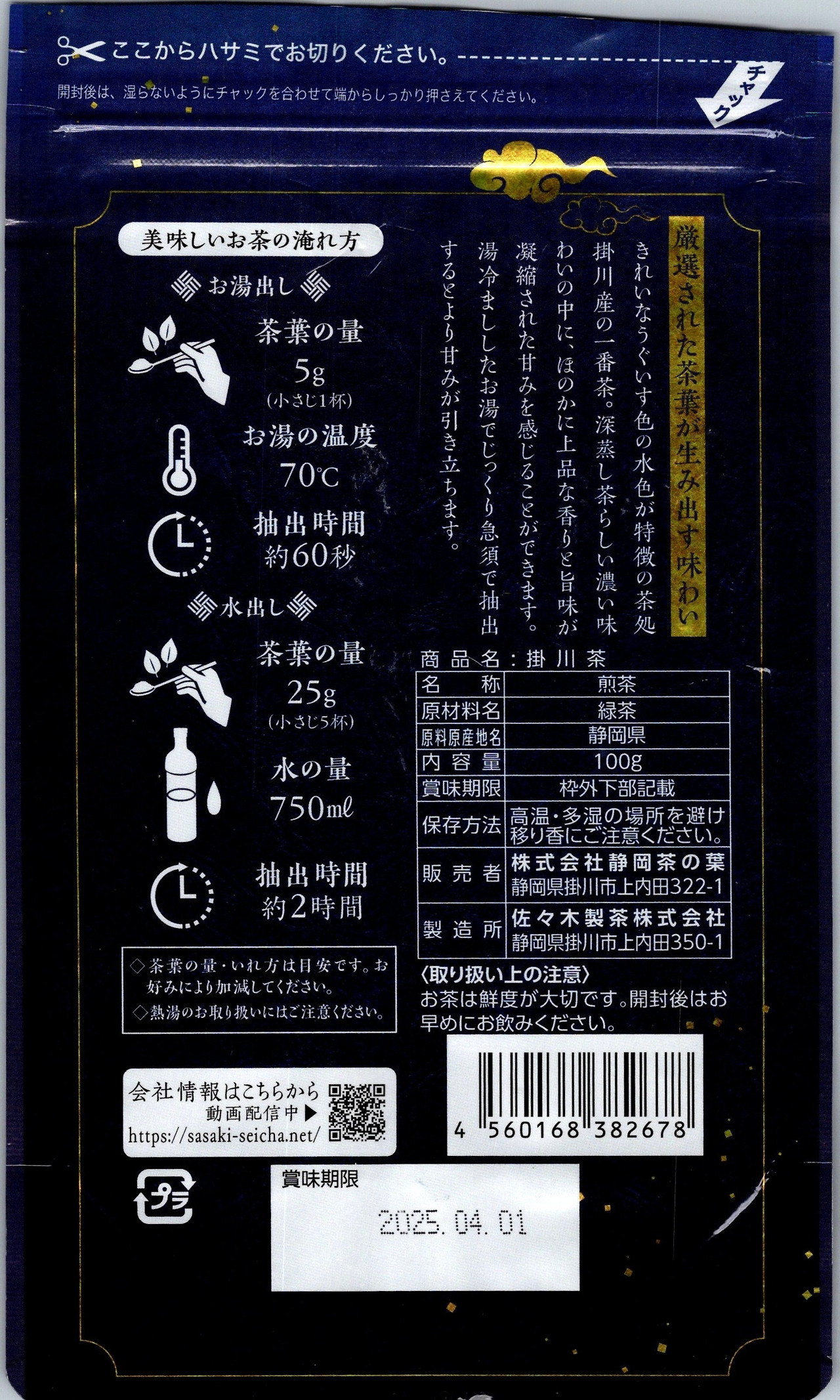 시즈오카현이라고 하면 후지산을 북쪽에 두고 펼쳐진 논밭이 생각나곤 하는데 아마도 시즈오카산 먹거리, 주로 찻잎을 구입할 때 포장지에 그려진 이미지를 자주 보면서 생긴 선입견 같은 게 아닐까 싶다. 시즈오카에서도 가케가와 지역은 하마마쓰의 동쪽, 그러니까 시즈오카시와 하마마쓰시의 중간 어디에 있는 동네인데 외국인 입장에선 정말 들어보기 어려운 동네가 아닌가 싶다. 봉투 앞에는 레이와 2년도 천황배 수상 다원이라는 홍보문구가 있는데 2020년 수상이란 이야기이니 조금 지난 이야기이긴 하다. 엄선된 찻잎의 부드러운 맛. 뒷면엔 맑고 고운 연두색의 수색이 특징이라고 적혀있는 듯. 그런데 이미지 사진에서부터 수색이 그리 맑지가 않다. 보통의 일본 센차는 미분이 많아 저렇게 뿌연 구름이 생기기 마련인데 언제쯤 적응이 되려는지. 근데 또 고오오급 센차일수록 미분도 적고 탕도 맑게 나와서 적응의 문제인가 늘 고민하곤 한다.