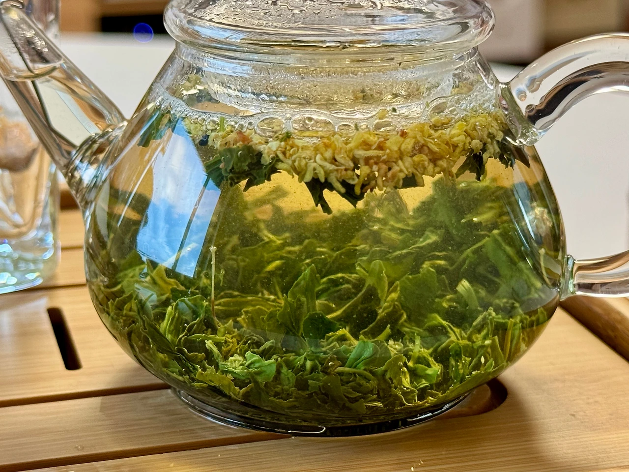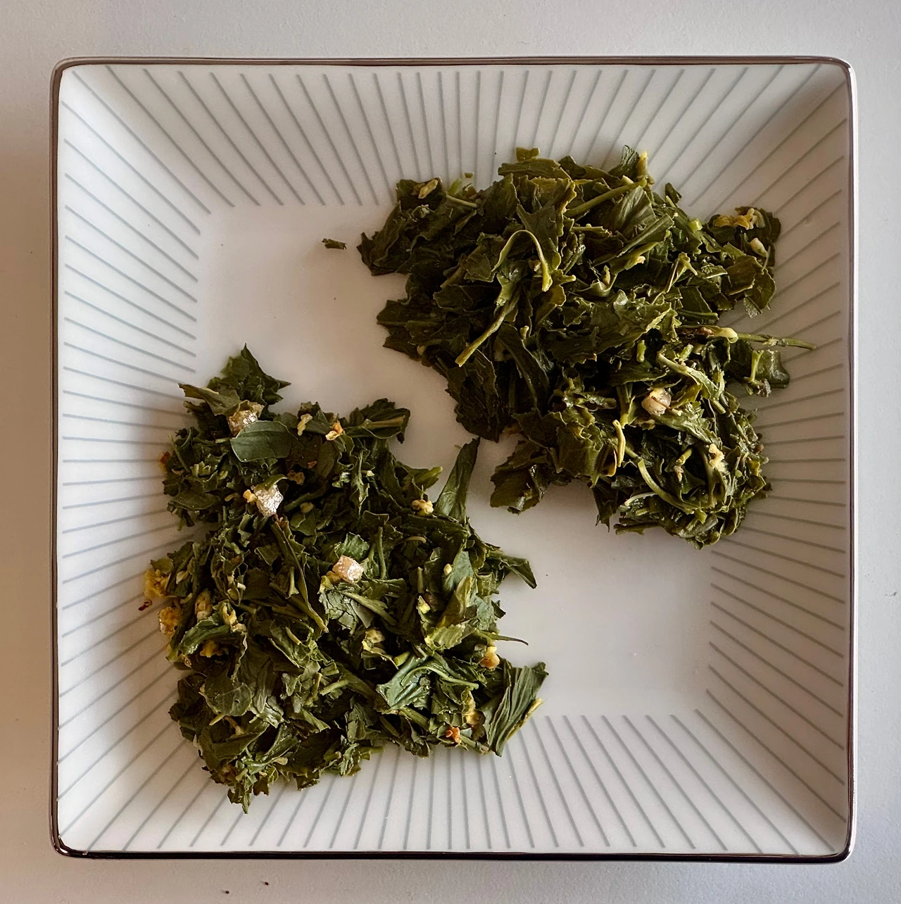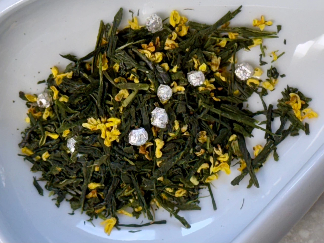 봉투를 열어보면 기존에 맡았던 금목서 블렌딩과는 조금 다르게 상쾌한 느낌이 더 얹어진 계화향이 난다. 우롱차나 홍차에 들어있던 계화는 은은하고 달달한 느낌이었다면 이번엔 좀 더 상쾌하면서 약간의 유항도 나는 깔끔하고 뽀얀 느낌의 달달함이다. 아무래도 들어간 센차 자체가 고소하고 기름진 느낌보단 상쾌한 느낌이 더 강한 종류이긴 한가보다. 건엽을 덜어내 보면 정말 풍성하게 들어있는 노란 계화에 은박의 무언가가 많이 섞여 나온다. 아라잔인가 싶다가 별사탕 모양이 아니어서 다시 보니 아라레에 은박을 입혔다. 계화에 아라레까지 들어가면 약간은 현미녹차 느낌일지도? (쑻) 그런 기대감이 들면서도 아라레를 보면 본능적으로 설거지 걱정이 되는 것이다. 그래도 녹차라 저온에서 짧게 우리니 괜찮지 않을까? 그러고 보니 노란 계화화 은단의 조화가 금과 은을 형상화한 거구나. 하핫 이런 개구쟁이들 (쑻)