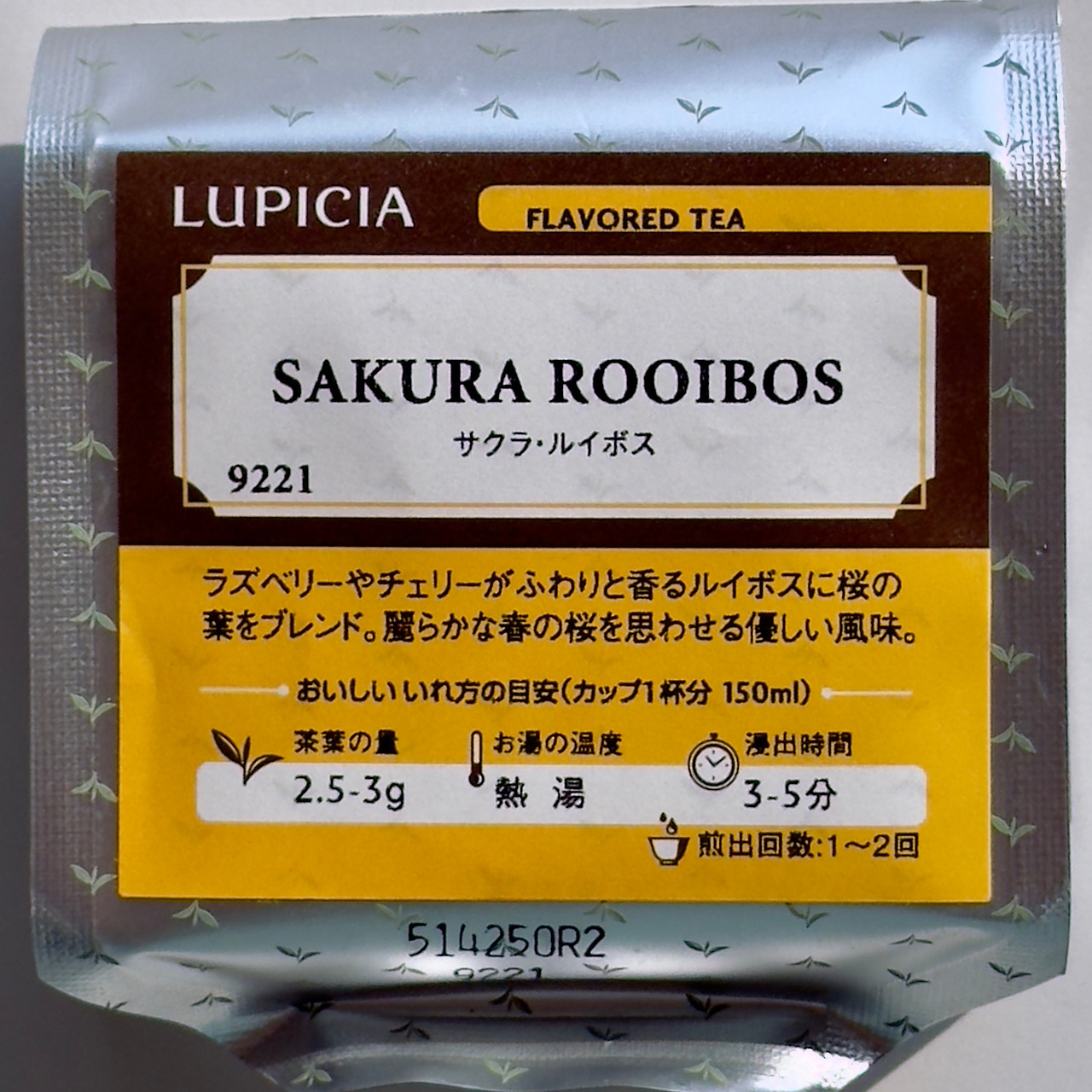 루피시아 사쿠라 시리즈의 마지막인 사쿠라 루이보스를 마셔본다. 하다 하다 이젠 루이보스에도 사쿠라를 넣는구나 싶었는데 꽤나 오래전부터 있었던 블랜딩이다. 내가 늦게 알았구나 싶은 사쿠라 루이보스. 뭔가 매년 나오지는 않고 가끔씩 나와서 내가 모르고 지나갔던 것 같다. 아무튼 루이보스에 바닐라나 초코등의 달달한 가향을 한다던지 과일향등의 상큼한 향을 넣는 건 상상이 되는데 꽃계열, 그것도 사쿠라바라고 하니 어딘가 상상이 잘 되지 않는다. 뭔가 시리즈를 완성한다는 느낌으로 어차피 구매했겠지만 상상이 잘 안 된다는 핑계로 이것도 두 봉지 구매. 50g 봉입으로 850엔이고 상미기한은 제조로부터 2년이다.