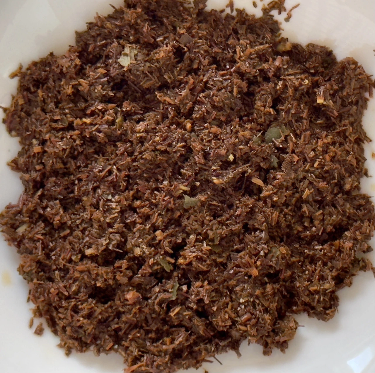 봉투를 열면 시큼한 풍선껌 향이 확 날아오르는데 요상한 체리향이라고밖에 표현을 못하겠는 향이 난다. 맞다, 라즈베리와 체리 가향이라고 했지. 자세히 맡아보니 그게 맞는 거 같긴 한데 아무래도 이건 그냥 시럽감기약의 어떤 향이다. 이게 모에요 진짜. 사람마다 조금씩 다르게 느껴질 순 있겠는데 아무튼 나는 좀 당황스러웠음. 건엽을 덜어내니 고운 루이보스 가루들이 쏟아져 나온다. 분쇄도가 높아 보이는데 루이보스 늘 그랬던 거 같기도 하고. 그 사이로 다양한 사이즈의 벚나무 잎도 보인다. 사쿠라바 말려놓은 게 맞나 싶은데 한 조각 맛을 보니 그런 것 같기도. 가향이 생각보다 찌르듯 진해서 사쿠라바의 향이 딱히 느껴지지는 않는다. 아무래도 사쿠라&베리처럼 은은하게 받쳐주는 역할을 하는 것 같다.