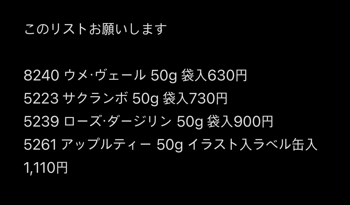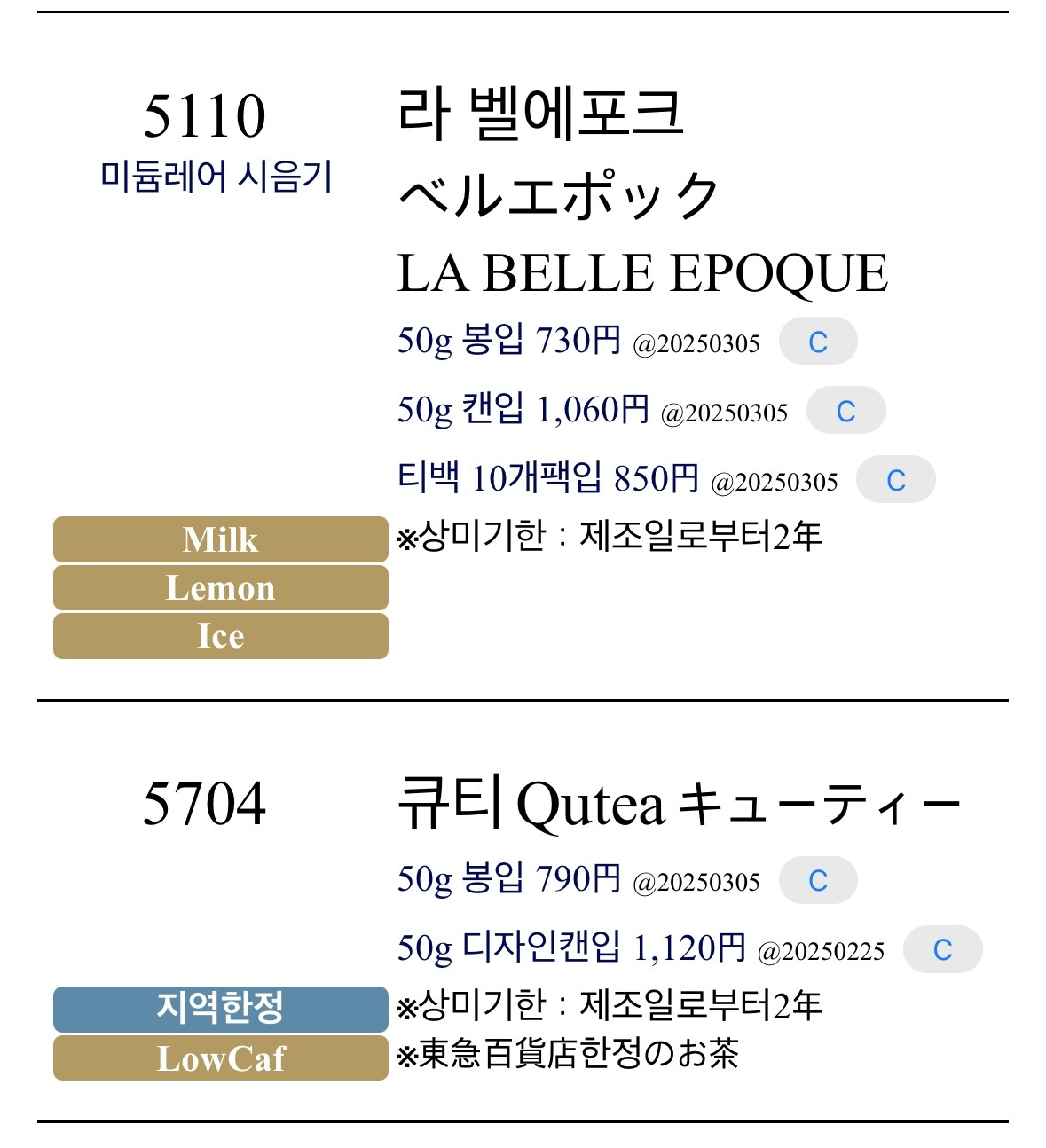 날짜 스탬프 옆의 C 버튼은 해당 상품의 정보를 일본어 텍스트로 복사해 줍니다. 예를 들어 5000 ダージリン・ザ ファーストフラッシュ 50g 袋入850円 와 같이 상품번호, 일본어 이름, 판매형태와 가격을 일본어로 복사해 줍니다. 복사된 텍스트를 메모장등에 붙여 넣어 주문리스트를 만들 수 있습니다.