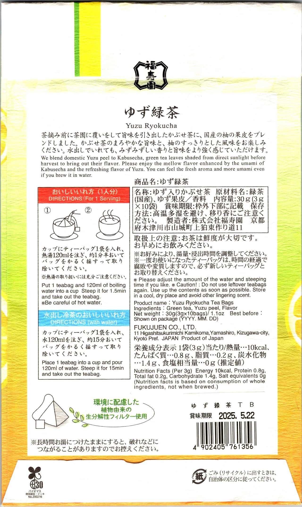 지난가을 다카마쓰 여행에서 들렀던 후쿠주엔. 그전에 샀던 교쿠로라던지 후카무시 센차가 마음에 들었던지라 다카마쓰에서도 이것저것 마음에 드는 걸 집어왔는데 그중 하나가 바로 유자녹차였다. 티백은 잘 사 오지 않는 편이지만 어째 유자녹차는 잎차는 팔고 있지 않아 선택의 여지가 없었다. 살까 말까 고민을 하다가 아무래도 맛있을 것 같아 결국 하나 집어오게 된 유자녹차. 차일피일 미루다가 이제야 마셔본다. 한창 신차가 나올 때이건만 내가 안 마셔봤으면 아직 신차지 뭐. 티백 10개들이 918엔으로 상미기한은 대략 1년이 좀 안 되는 것 같다.