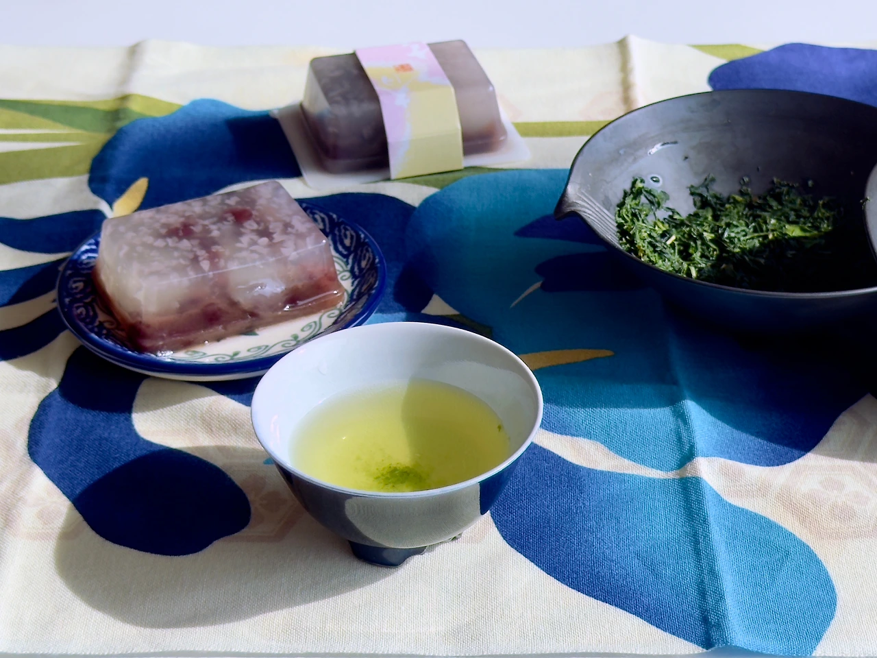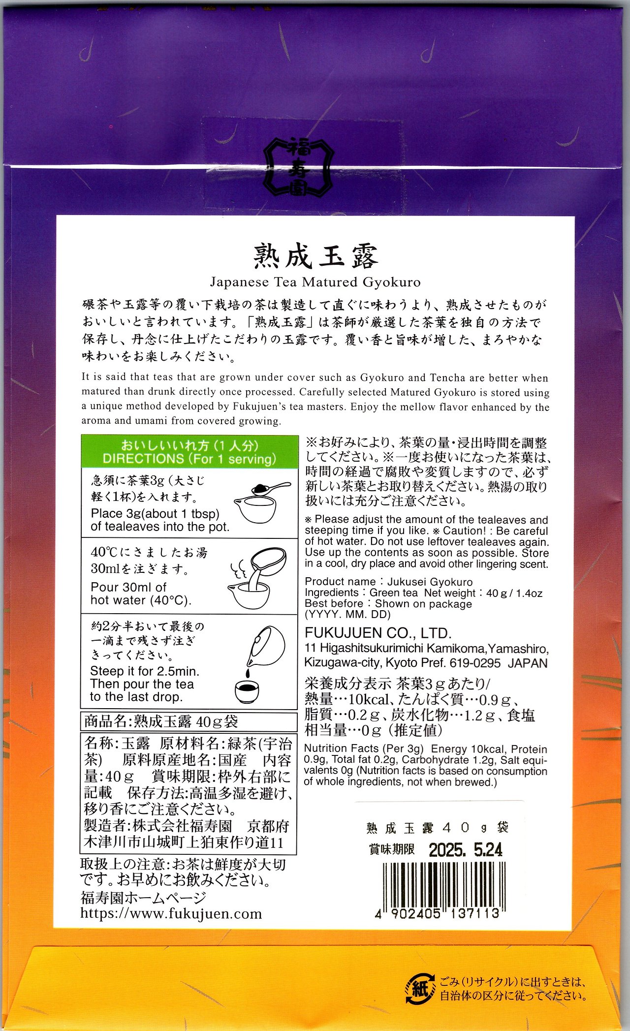 후쿠주엔의 스몰사이즈 패키지에 맞춰 종이봉투+은박지퍼백의 조합으로 구성되어 있다. 중심이 되는 녹차라인들이 별도의 이름과 함께 대나무 같은 격자문양의 디자인으로 통일된 디자인을 사용하는 것과 별개로 파생되어 만들어지는 녹차들은 이렇게 별도의 디자인을 주는 경향이 있는데 해가 지고 난 직후의 하늘 같은 강렬한 디자인이 뭔가 맛도 강렬할 것 같은 인상을 준다. 정확히 어떤 인상을 주고 싶었는지는 잘 모르겠지만. 재미있는 건 역시 교쿠로의 레시피인데 레귤러 상품인 교쿠로 '킨카쿠'와 동일한 레시피를 사용하고 있다. 3g의 차를 사용하여 잔에 따라지는 건 약 20ml 정도의 녹차가 나오는 극도로 진한 추출법으로 비교적 저온에서 천천히 우려내어 떫은맛은 거의 없게끔 우려내는 방법이다. 누구는 미역국 식은 국물 같다고도 하는 바로 그 추출법이다. 이런 스타일이 싫다면 온도를 조금 올리고 시간을 줄이는 방법으로 좀 더 일반적인 녹차에 가깝도록 우릴 수 있겠지만 나는 미역국 좋아하므로 저대로 간다.