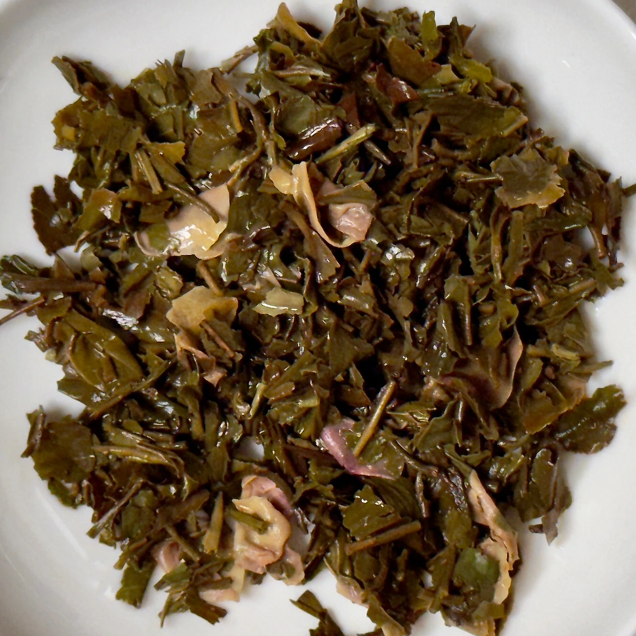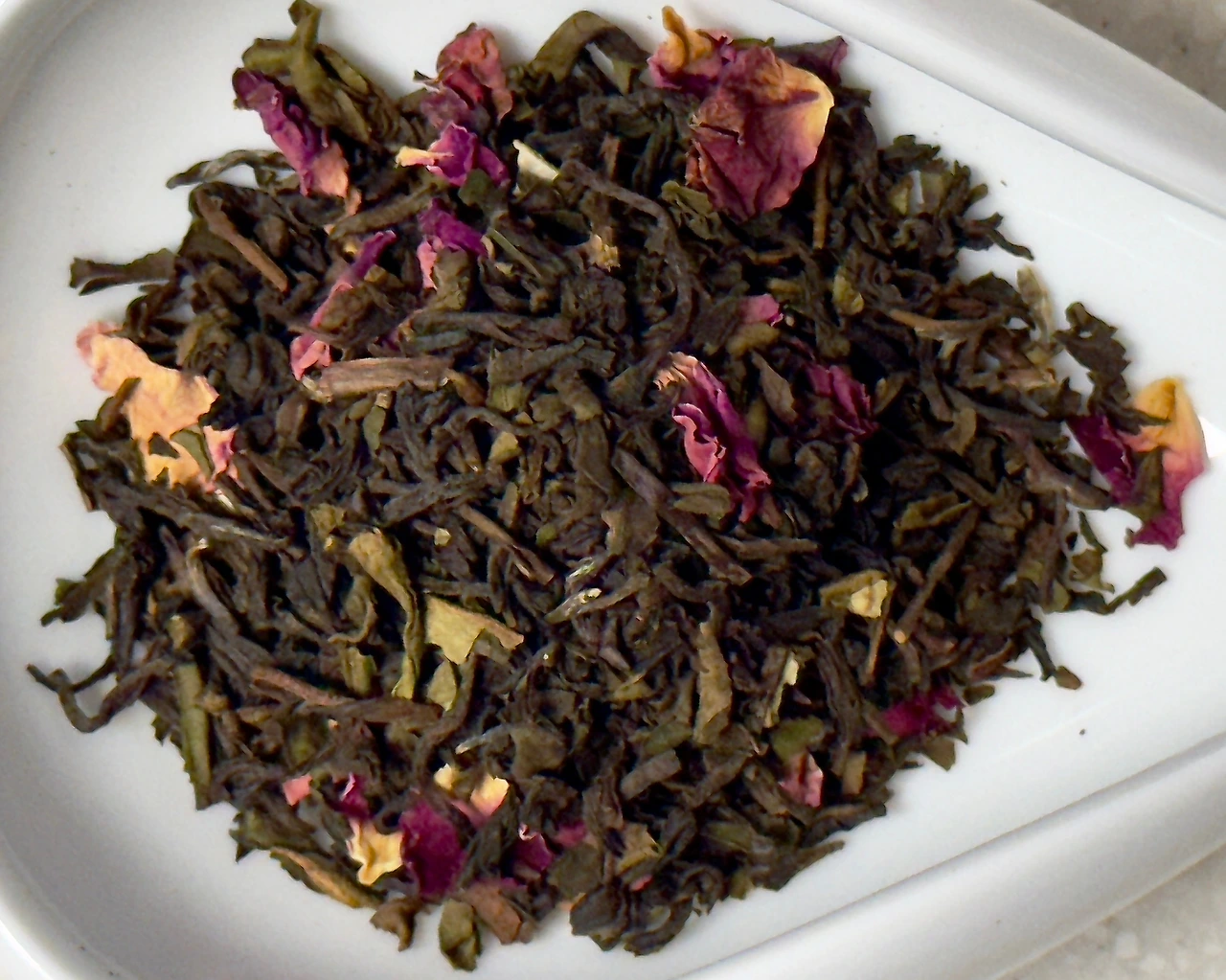 봉투를 열어 향을 맡아보면 은은 달달한 로즈향이 의외로 휘발성 거의 없이 순하게 풍겨오고 그 뒤로 구수꼬릿한 발효취가 섞여 올라온다. 그렇다고 인지부조화가 올 것 같은 매주 된장 그런 향이 아니고 로즈향과의 조화가 약간은 말린 크랜베리향처럼 느껴지기도 한다. 최근의 다즐링은 아무리 어텀널이라고 해도 마른풀냄새가 강하지 발효취가 있는 경우는 드물었는데 특별히 고른 다즐링을 사용한 건지 아니면 가향 에센스와 섞이면서 추가적인 발효가 일어났는지 그 부분은 잘 모르겠다. 단순히 산화도의 문제가 아니고 미세하게나마 직접발효가 관여한 느낌이다. 일반적인 제다환경에서 직접발효를 원천 차단한다는 것도 사실 말이 안 되는 일이니 보통의 다즐링보다 관여도가 조금 더 높았을 수 있지 않을까 하는 정도. 나에겐 이쪽이 훨씬 오소독스한 옛날식 다즐링의 느낌이긴 하다. 건엽을 살펴보면 확실히 산화도가 꽤 있는 다즐링 사이로 꼬릿 한 로즈레드들이 섞여있다. 베이스티에 대한 부분을 제외하면 개봉 전에 예상했던 그대로이다. 꽤나 평범해 보인다.