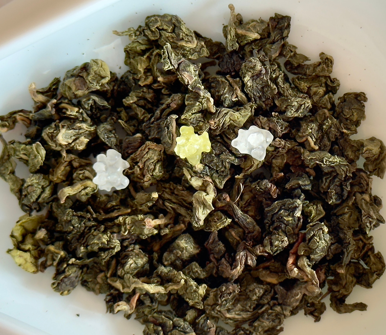 봉투를 열어보면 의외로 하츠코이나 나츠코이 같은 진한 레몬향이 아닌 소다향과 좀 섞인듯한 묘한 쇠향이 나는데 그러고 보니 좀 더 음료수인 레몬 스쿼시에 가까운 향이 되려면 이게 맞는 것 같기도 하다. 쎄한 이 향이 나중에 마실 때 더 재미있게 올라오는데 그 부분은 뒤에서. 급하게 건엽을 덜어내니 의외로 대만우롱처럼 단단히 포유 된 우롱차와 노랗고 하얀 금평당이 함께 나온다. 금평당이 의미하는 건 레몬의 노란색과 레몬스쿼시의 하얀색이겠지. 귀엽다. 우롱차는 아마도 민남우롱으로 철관음이 아닐까 싶다. 보이기에도 그렇게 보이지만 일반적인 루피시아의 과일우롱이 청향이었던걸 생각하면 아무래도 청향 철관음 외엔 떠오르지가 않는다. 농향이나 암운이 느껴지는 차에 레몬 스쿼시? 아무래도 이미지가 잘 매칭이 되질 않는다.