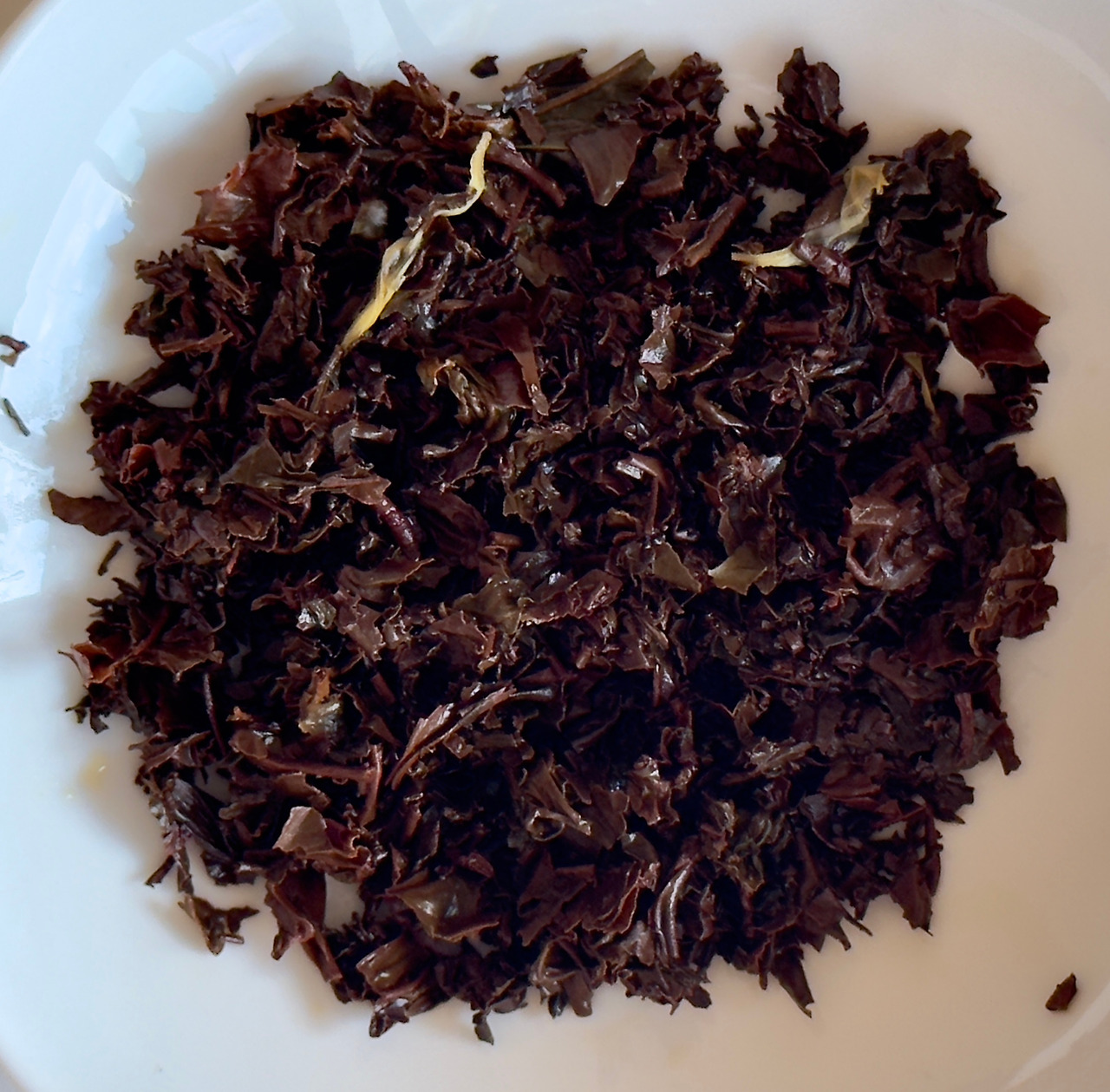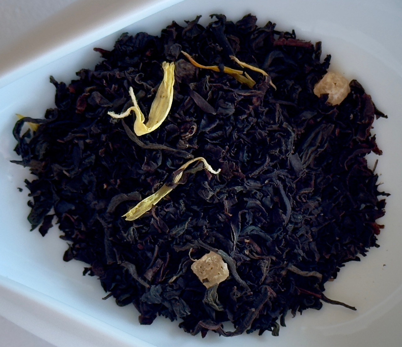 봉투를 열어 향을 맡아보면 강한 휘발성의 가향이 순식간에 폐까지 훅 치고 들어온다. 휘발성의 향이 워낙 강해서 그 끝에 건조하게 느껴지는 향이 약간은 코코넛스럽기도 한데 오랜만에 맡아보는 강한 느낌이라 약간은 아찔하다. 부드러운 느낌이 아니라 정말 찌르듯 하는 가향으로 우렸을때 가향취가 너무 심해서 지저분하지 않을까 걱정이 될 정도. 건엽을 덜어내 보면 메리골드가 가장 먼저 눈에 띄고 건과일이 들어있는데 처음엔 몰랐으나 마시다 보니 이게 종류가 좀 다양한 것 같아서 찾아보았더니 파파야와 파인애플 두 종류가 들어있다고 한다. 찾아보면서 알게 되었는데 휘발성이 강하게 느껴진 건 구연산까지 추가되어서 그랬던 듯. 닐기리 내지는 실론같이 생긴 건엽이라고 생각했는데 인도와 베트남 홍차라고 한다.