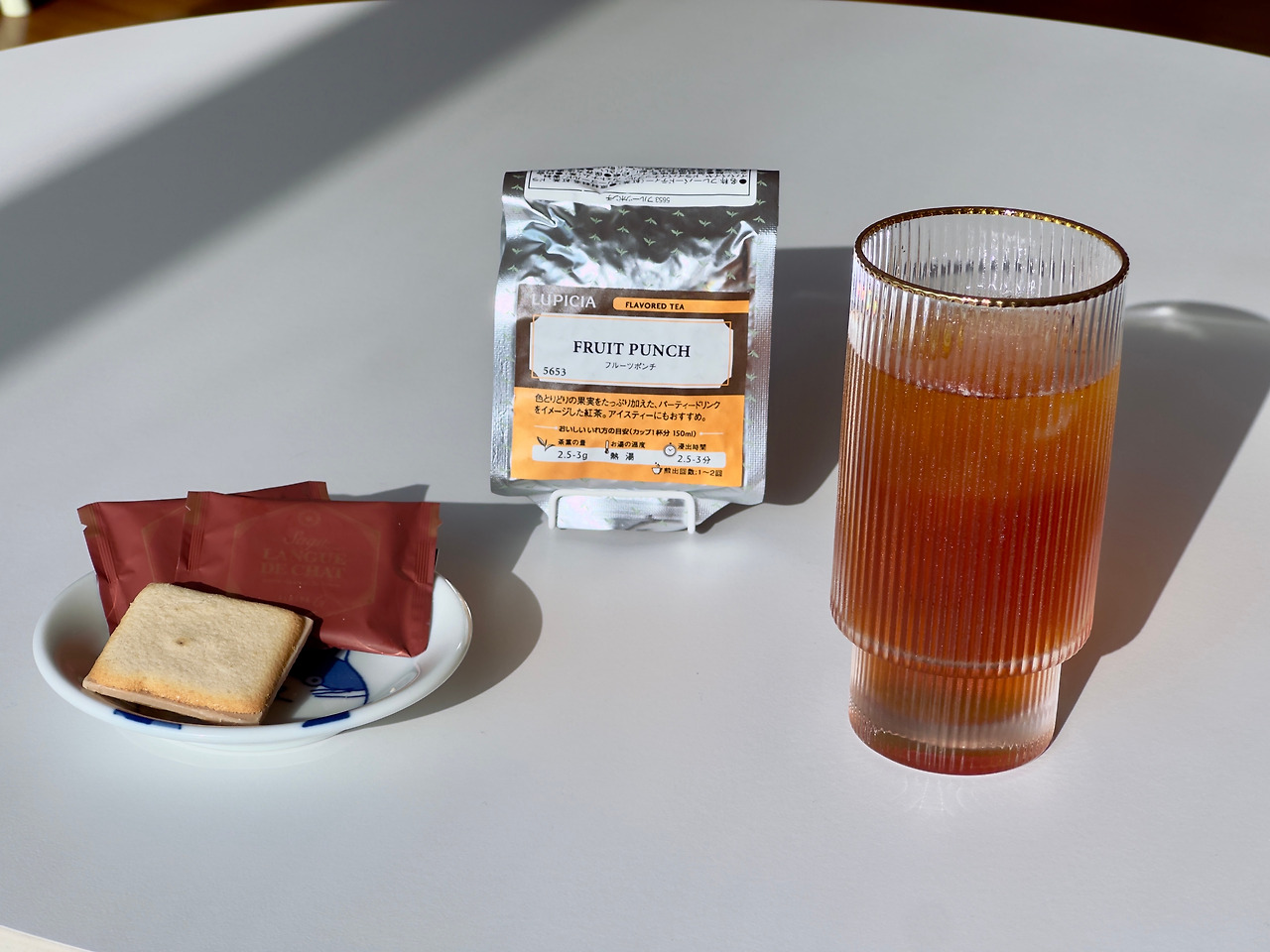 아이스티 추천이기도 하고 딱히 따뜻하게 마실 생각이 들지는 않아서 우선 급랭으로 마셔보았다. 6g의 찻잎을 100도씨의 물 150ml에서 2.5분 우려낸 뒤 얼음 가득한 컵에 따라내었다. 가끔 정석대로 얼음으로 온도 맞춘 뒤 다시 얼음컵에 부어줄까 싶은 마음이 들 때도 많은데 아무래도 탕비실에선 생략가능한 과정은 생략하기 마련이다. 물론 얼음을 정말 충분히 많이 넣어주기 때문에 그렇기도 하고. 덕분에 사진에서 크림다운 현상이 흔히 보이긴 하는데 회사에서는 크림다운이 의외로 잘 생기진 않는다. 얼음차이인가 싶다. 아무튼 우려내고 나면 의외로 건엽에서 나던 향에 비해 꽤나 온순한 향이 되어있다. 그레나다라던지 트라이앵글 같은 열대과일 시리즈들과 비슷하면서도 약간은 다른 느낌으로 플라워리한 느낌 전혀 없이 정말 과일을 슬쩍 우려낸듯한 맛에 향도 안으로 파고드는 찻물에서만 느껴지는 향이다. 목넘김의 순간 반짝하고 나타났다가 사라지는 향. 비강으로 치고 올라오는 향이 산미 있는 과일 통조림 주스스러움이 있긴 한데 사실 전체적인 차의 향이 해상도가 좋은 느낌은 아니다. 어딘가 뭉뚱그려져서 뭐가 뭔지 잘 모르겠는 향. 허긴 그런 점이 좀 더 파티 드링크로서의 정체성에 어울리는 느낌이긴 하다. 화사한 색감이라기 보단 어딘지 모르게 정체불명의 벌크음료 느낌. 이렇게 이야기하면 이걸 왜 마시나 싶은데 너무 화려하고 너무 굉장한 걸 마시면 지치는 느낌이 들 때도 있고 그런데 후르츠펀치의 매력은 그냥 아무 생각 없이 시원하게 마시기 깔끔하고 좋다는 것.