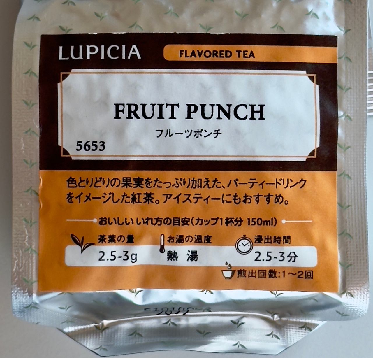 루피시아의 아이스티 추천 차들 중 파티음료 카테고리 중 하나인 후르츠 펀지를 마셔본다. 그랑마르쉐 한정으로 구매 자체는 겨울 온라인 그랑마르쉐에서 진즉에 구매해 두었다가 한여름에 잘 마셨다. 오프라인 회장에도 당연히 있었고 여름 온라인 그랑마르쉐에도 팔아줬었는데 여름 온라인 때는 가격이 좀 오른 것 같다. 열대과일 등의 아이스티 추천 과일 홍차가 이미 많기도 한데 다양한 한정판으로 너무 많은 베리에이션을 만들어두는 게 아닌가 싶기도 하지만 결국은 마셔봐야 아는 거 아니겠는가. 50g 봉입으로 680엔, 2개 구입했고 상미기한은 제조일로부터 2년이다.