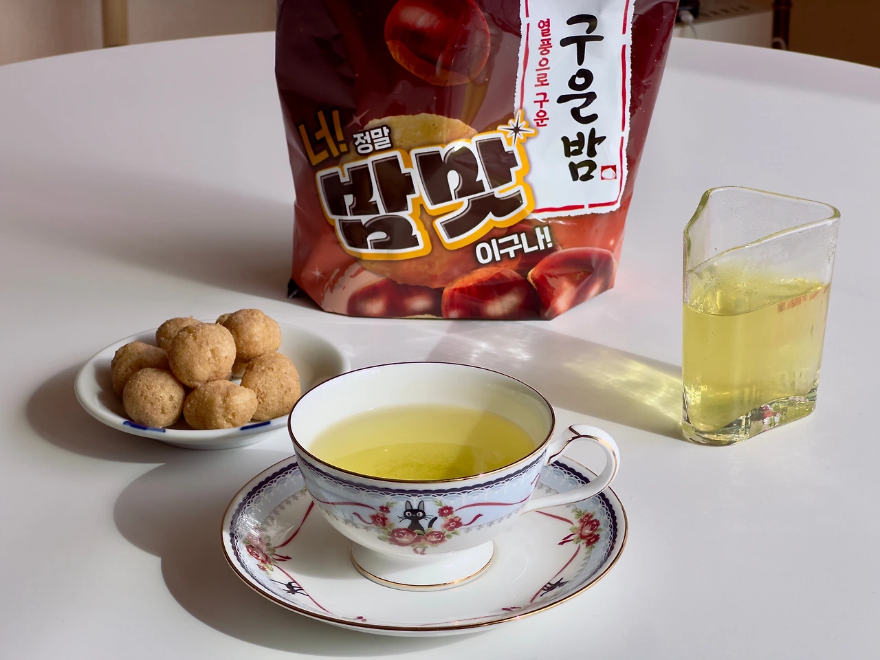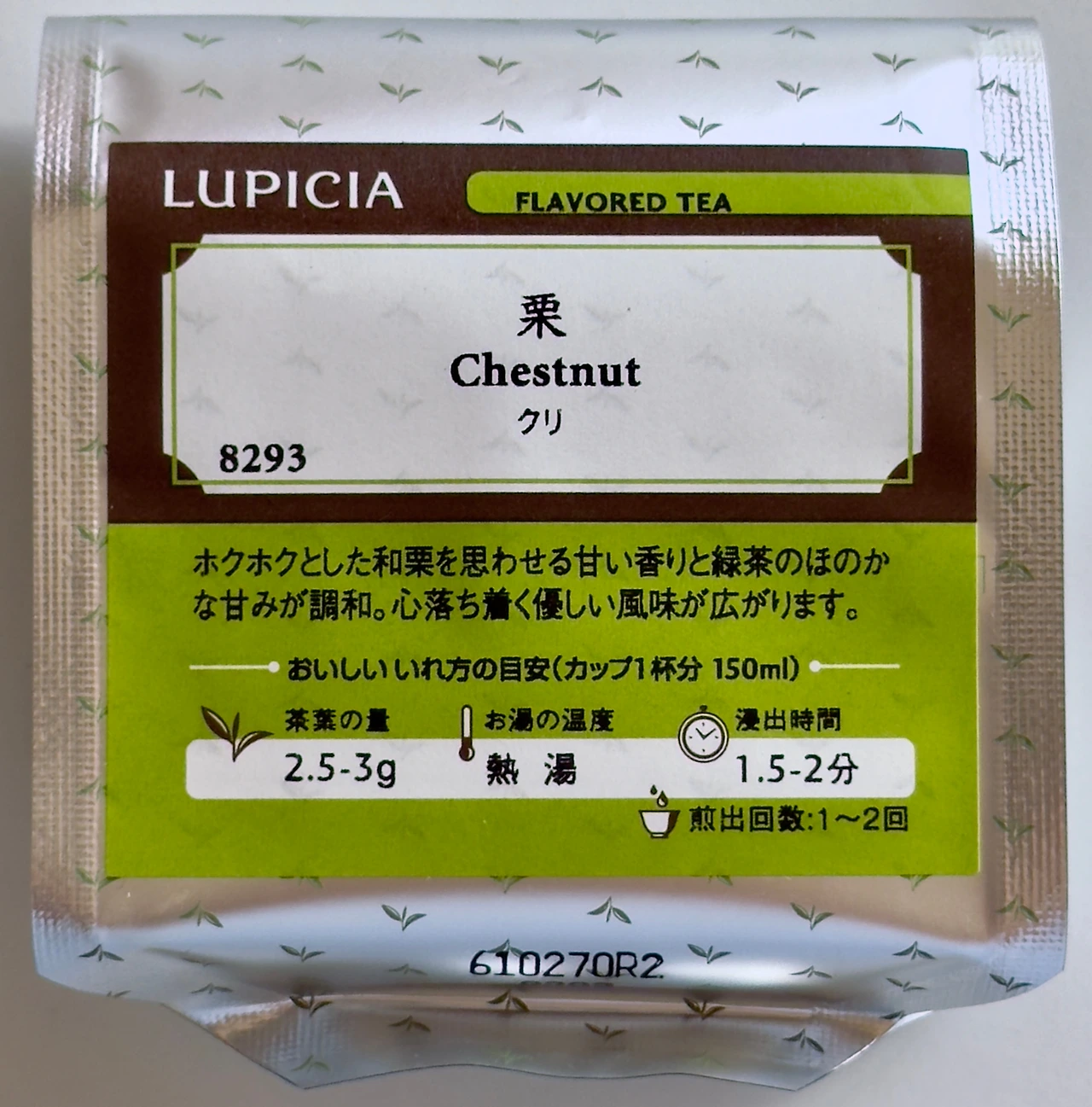 봉투를 열어보면 밤향이 나긴 하는데 무슨 질소 같은 산화방지 가스 같은 향이 절여진 느낌이다. 자세히 맡아보면 분말라떼향 같은 게 나긴 하는데 뉘앙스가 너무 다르다. 쎄한 향이라고 해야 하나. 근래 열어본 루피시아 중에서 가장 당황스러운 향. 드라이마롱이 너무 구워지거나 뭔가 잘못된 느낌인데. 어쨌거나 건엽을 덜어내어 보니 평범한 일본 녹차에 큼직한 마른 밤이 들어있다. 건엽을 봐서는 딱히 뭐가 바뀐 건지 모르겠는 느낌. 아무리 생각해 봐도 근데 아니 향이 이게 맞아?