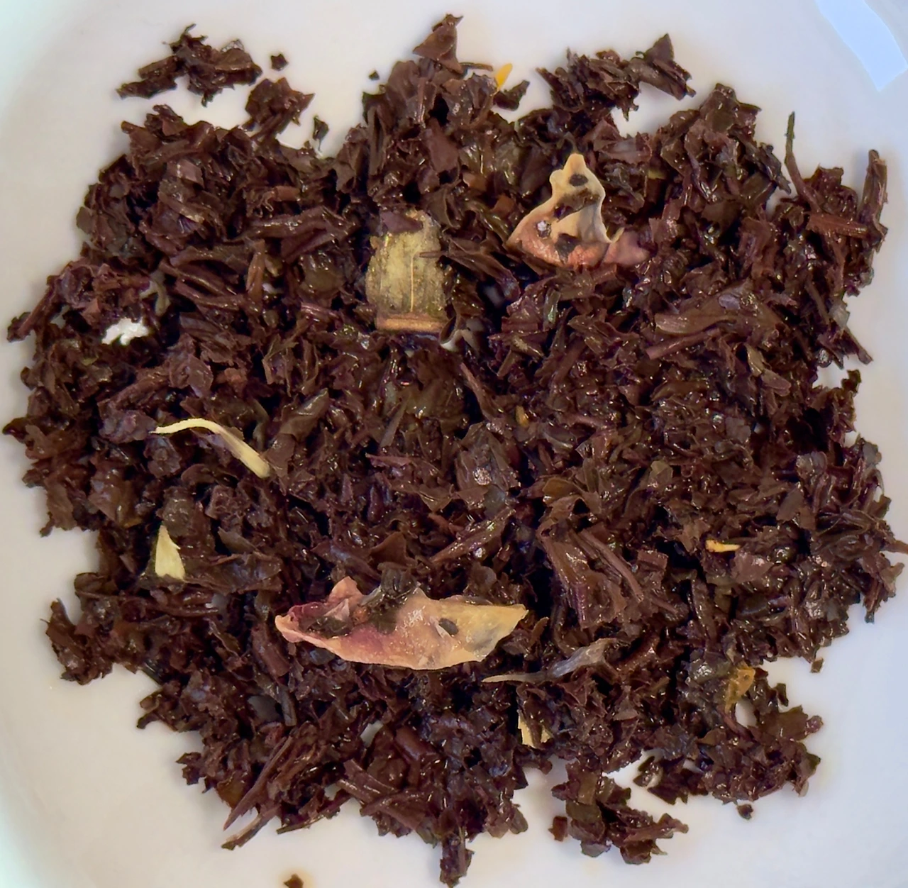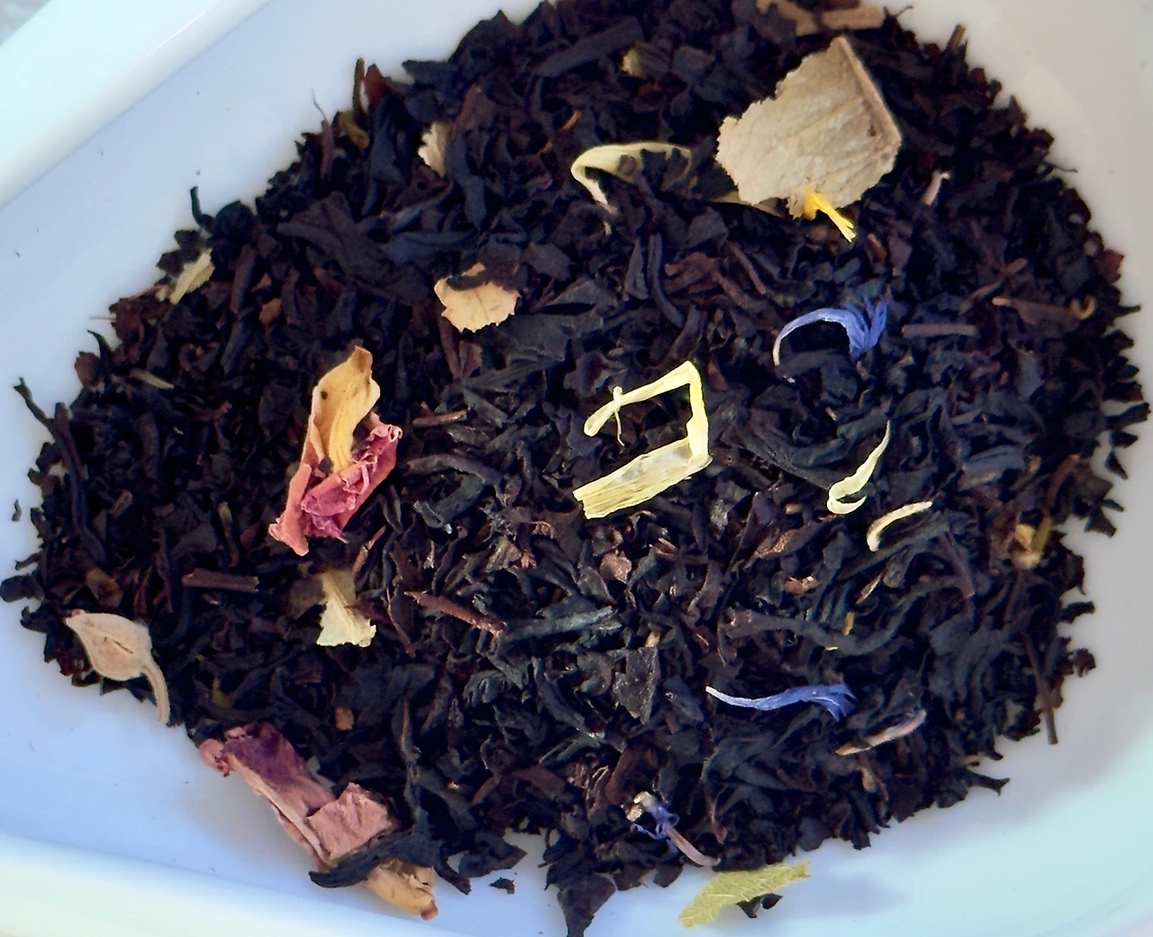 봉투를 열면 푱 하고 튀어오르는 가향. 복숭아향과 체리향이 섞여서 쨍하지 않은 세리지에 같은 향이랄까. 확실히 백도 가향보다는 조금 더 진득한 황도의 느낌이 있긴 한데 이게 체리향에 섞인 백도 같기도 하고. 애초에 그렇게 큰 차이는 없으니까. 전체적인 가향의 인상은 역시 메르시 밀포아랑 비슷한 결을 가지고 간다. 건엽을 덜어내 보니 크지 않은 홍차엽과 린덴, 로즈레드, 콘플라워, 마리골드가 토핑되어 있어서 보는 재미가 쏠쏠하다. 메르시 밀포아의 히스플라워의 역할을 대신하는 게 린덴인 것 같은데 일단 린덴이라고 하면 평화와 사랑의 꽃으로 유명하니까 또 의미가 남다르겠다. 나 같은 경우엔 괴테라든지 슈베르트 생각나면서 비극적인 이미지가 떠오르긴 하는데 원래는 그게 아니라고 하니까. 갑자기 괴상한 축하가 될 뻔했군. 잊으세요. 헷.