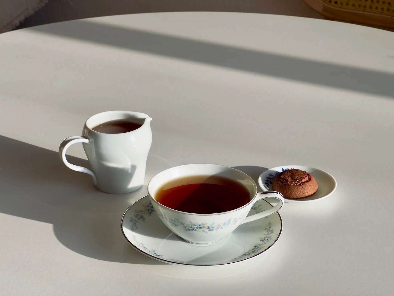 평소처럼 6g의 찻잎에 끓는 물 300ml를 부어 2.5분 우려내었다. 화려하게 발산하지 않고 다구 안으로 머금어지는 향이다. 건엽에서의 화려한 부케의 이미지와는 다른 소박한 느낌의 따스함이다. 백도와는 미묘하게 다른 조금은 무거운 톤의 복숭아 가향이 주를 이루는 가운데 오히려 베리류에 더 가까운 체리 가향이 아주 옅게 지나간다. 찻물은 부드럽지만 목 뒤로 넘기고 나서 수렴성이 붙는 편으로 부드러운 것에 비해 어떤 다식을 곁들여도 쉽사리 밀리지는 않을 것 같다. 그야말로 범용 홍차라는 느낌. 화사한 느낌을 원한다면 따뜻하게 마실 때보다 급랭으로 차갑게 식혔을 때 그 매력이 배가되는데, 얼음 위로 뜨거운 찻물을 부어 순식간에 식혀내면, 뭉근하던 과일 향이 쨍하게 살아나며 청량한 축배를 드는 기분이 든다. 마치 샴페인을 터뜨리듯, 시원하게 목을 타고 넘어가는 펠리시타시옹 한 잔. 축하할 일이 없는 날에도, 이 차를 마시는 순간만큼은 나 자신에게 작은 축하를 건네는 기분이 든다. 냉침은 비추인 게 체리 가향이 워낙 앞에 나서고 있기 때문에 냉침을 했을 때 다른 모든 향들이 죽고 거의 세리지에와 가까운 체리체리한 가향차가 되어버리고 만다. 물론 그것도 좋은 향이고 맛있기는 하지만 그럴 거면 세리지에를 마시는 게 낫지 않나. 아니다, 펠리시타시옹이 계절 한정이 아니니까 대용으로 쓰는 방법도 있긴 하겠구나.