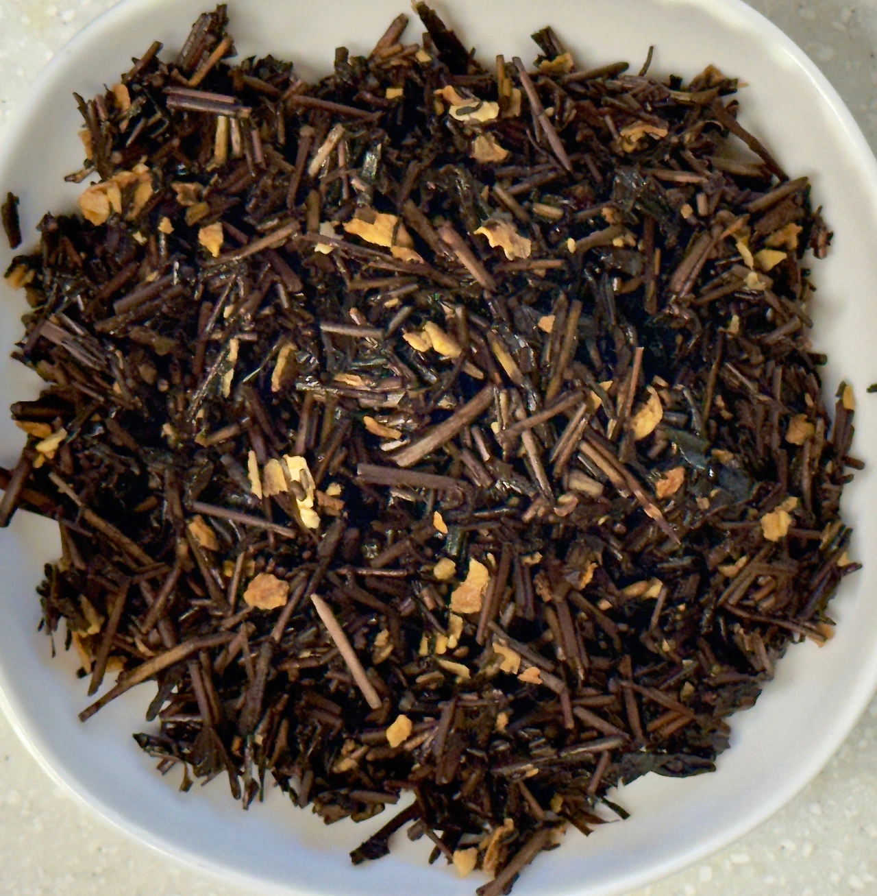 봉투를 열면 생강이 많이 들어간 하얀 센베이 향이 확 퍼진다. 호지차의 향은 끝 어딘가에서 나는 것도 같은데, 그냥 생강에 달달한 향이 더해져 너무나도 하얀 생강 센베이 향이라서 이거야말로 추억의 향기 아니겠냐고. 파삭하지 않고 적당히 진득하게 물어지는 식감까지 떠오를 정도다. 건엽을 덜어내어 보면 갈색빛 줄기차 사이사이에 자잘한 생강 조각들이 박혀 있다. 건엽의 구성 자체는 호지차와 생강 조각 딱 두 가지뿐인 깔끔한 구성이다.