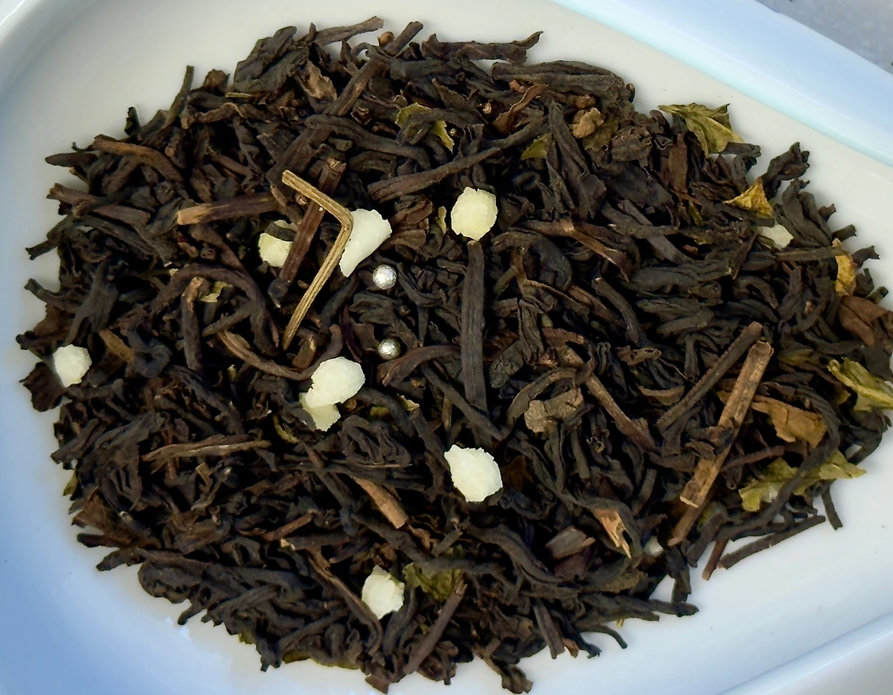 봉투를 열어보면 은은한 라벤더와 민트향이 섞여서 새로운 허브같이 느껴진다. 러쉬 향 같다고 하면 분명 또 찌르는 듯한 진한 향이라고 생각할 텐데 그런 느낌이 아니고 희석에 희석에 희석을 거친 아주 연한 향이면서도 확실히 파스텔 톤의 느낌은 있는, 그런 종류의 향이다. 시큼하거나 쏘거나 풍선껌스럽다는 느낌이 전혀 들지 않으면서도 밝은 톤의 가향이라는 게 재밌다. 라벤더라고 하면 아무래도 너무 진해서 코가 아픈 경우가 많은데 흔치 않은 기분 좋은 라벤더. 건엽을 덜어내면 우선 아라레와 아라잔이 쏟아져 나와 기분 좋은 이벤트의 기분을 전달해 준다. 은침의 아라잔이 녹으면서 반짝거릴 찻물을 생각하니 크리스마스 시즌의 밤 차로 추천할만하단 생각. 실론 홍차 사이로 푸릇한 나뭇잎 조각들이 보이는데 페퍼민트 컷이 아닌가 싶다. 라벤더 가향이 기가 막히게 완급 조절이 되어있다는 생각을 다시 한번 하게 된다.