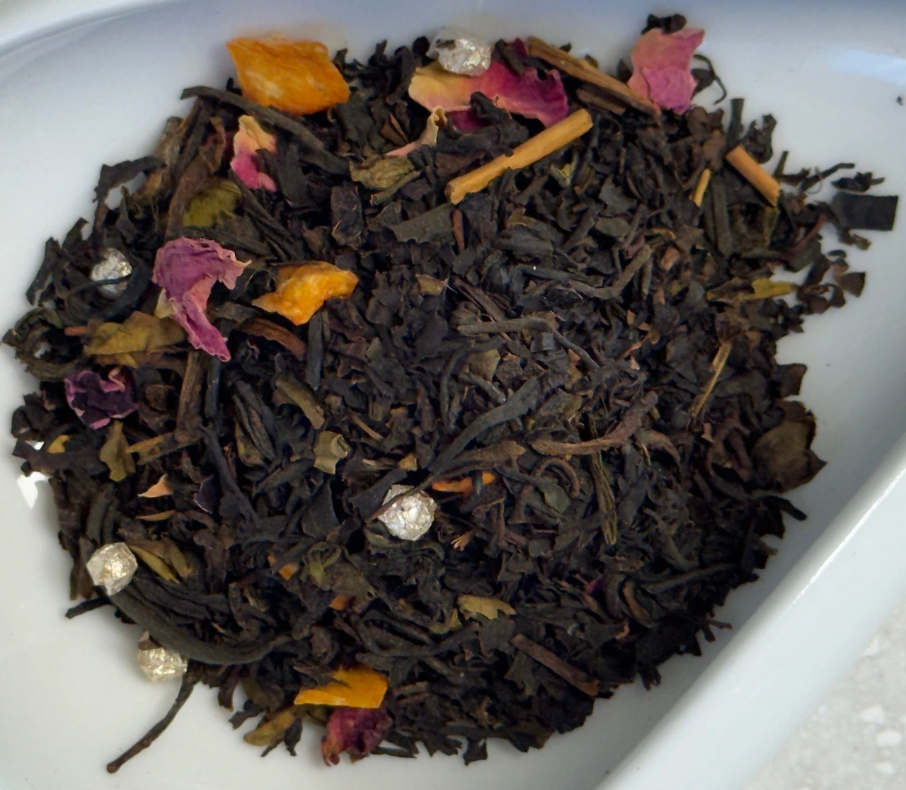 봉투를 열면 익숙한 루피시아 스타일의 베리 가향이 팟하고 올라온다. 휘발성의 가향을 그러고 보니 꽤 오랜만에 맡아보는 듯. 무슨 베리라고 말하기 어려운 달달한 레드베리 느낌의 가향이 꽤나 클래식한 느낌으로 다가온다. 휘발성의 쏘는 느낌을 제외하면 가향 자체는 꽤 뭉툭해서 두루뭉술하게 베리 향이라고 느껴지는 빈티지 느낌. 가장 기대가 되는 건엽의 모양을 보기 위해 덜어내어 보니 붉은 장미 꽃잎에 은박으로 코팅된 아라레들과 함께 사각의 당근 칩들이 함께 토핑되어 있다. 근래에 나온 루피시아 블렌딩 중 가장 도발적인 토핑 아닌가 하는 생각이 든다. 살짝 기묘하단 느낌이 들 정도. 특이하다 싶어 원재료를 살펴보면 몇 가지 더 재미있는 게 있다. 베이스로 쓰인 홍차는 인도 홍차에 일본 홍차가 블렌딩이 되었다고 하는데 건엽을 살펴봐도 일본 홍차를 알아보기는 좀 힘들고 대신 줄기가 꽤 섞인 듯이 보인다. 거기에 광택제가 사용되었다고 하는데 아라레의 은박 코팅이 별도로 적힌 걸로 봐선 어디에 쓰인 건지 잘 모르겠다.