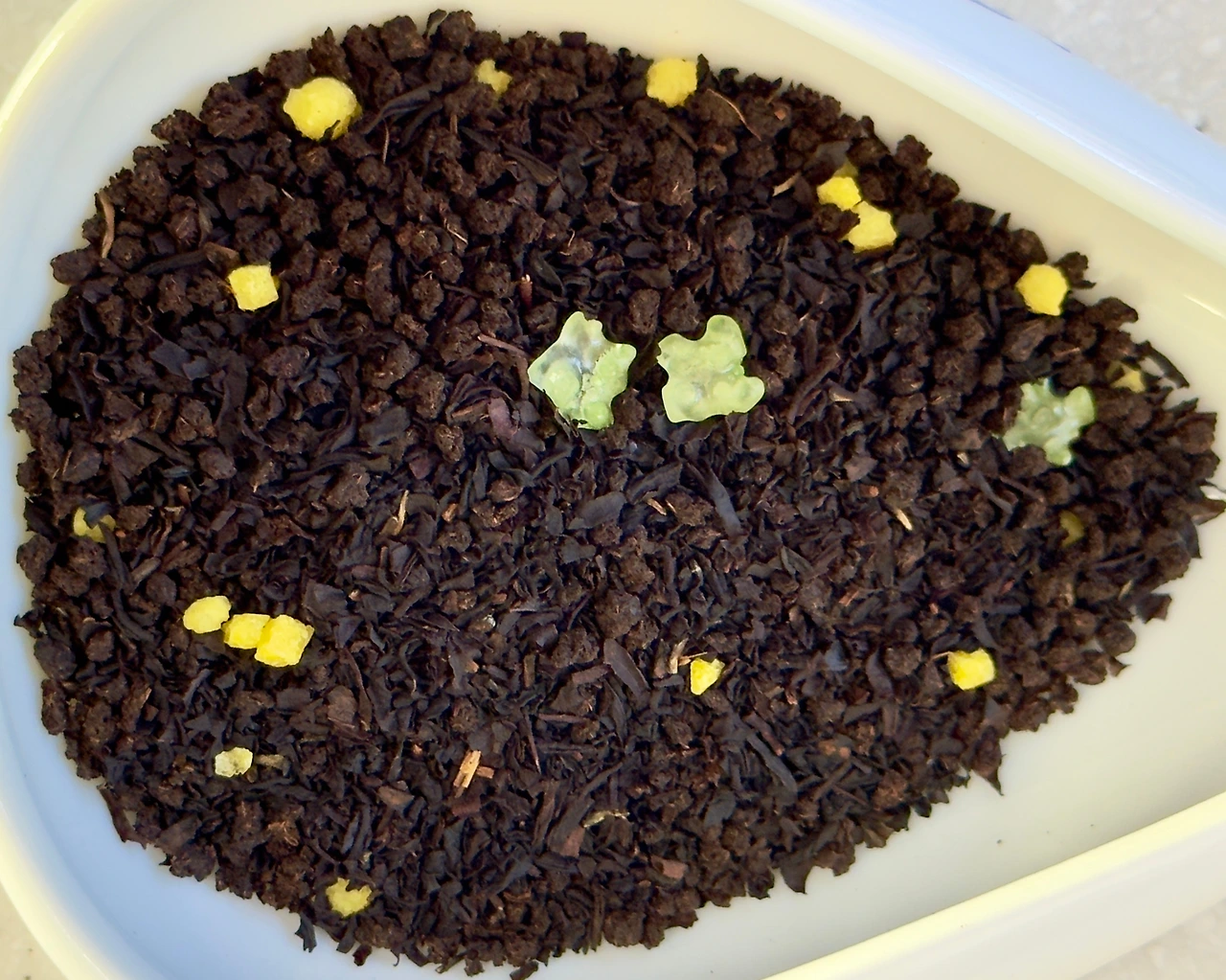 봉투를 열면 루피시아 가향 특유의 찌를 듯한 날카로움은 없고, 대신 설탕과 버터로 밀가루가 구워진 듯한 구움 과자의 향이 부드럽게 올라온다. 쿠키스러운 향 뒤에 숨었다고 해야 하나 잘 가려졌다고 해야 하나. 아무튼 메론빵이라기보다는 메론쿠키 같은 느낌. 어찌 보면 마롱 계열의 과자 향 같기도 한데, 트릭 오어 티를 비롯한 쿠키 가향 차들 중에 이런 마롱 계열 뉘앙스가 꽤 있어서 비슷하게 연상이 되는 듯하다. 아무래도 과자 향이 메인이다 보니 결이 비슷하다. 건엽을 덜어내어 보면 대부분을 차지하는 CTC들과 잘게 잘라진 홍차 잎들이 보인다. 원산지가 베트남, 케냐, 인도인 걸로 보아 가향 블렌딩에 편하게 쓸 수 있는 차들로 구성한 듯. 노란 아라레들이 메론빵의 소보루 같기도 하고 투명한 녹색의 금평당들이 함께 어우러져 메론빵의 색감을 떠올리게 한다. 에센셜한 색 두 개를 잘 뽑아 두었네.