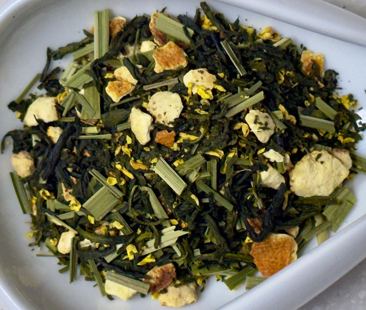 봉투를 열어 향을 맡아보면 가향이 어느 정도 있긴 하지만 훨씬 허벌 인퓨전에 가까운 느낌이다. 레몬그라스와 드라이한 오렌지필 같은 마른 껍질 향이 지배적이고, 그 위로 금목서의 향이 살짝 얹혀 있다. 시트러스 가향이 살짝 느껴질 때쯤 약간은 오렌지 주스 같은, 혈당이 차오르는 듯한 달콤한 향도 느껴진다. 건엽을 덜어내어 보면 확실히 녹차의 비중이 반을 넘지 못하는 듯한 느낌마저 든다. 레몬그라스와 오렌지필이 토핑의 수준은 진즉에 넘어선 꽤나 많은 비중을 차지하고 있다. 간간이 보이는 금목서가 오렌지필이 부서져서 떨어져 나간 부스러기 같단 착각이 들 정도. 그러고 보면 센차가 아니라 덖음차 같은 녹차가 들어있는데 이렇게 되면 베이스가 훨씬 물질감 적게 블렌딩되지 않을까 싶은 생각도 든다.
