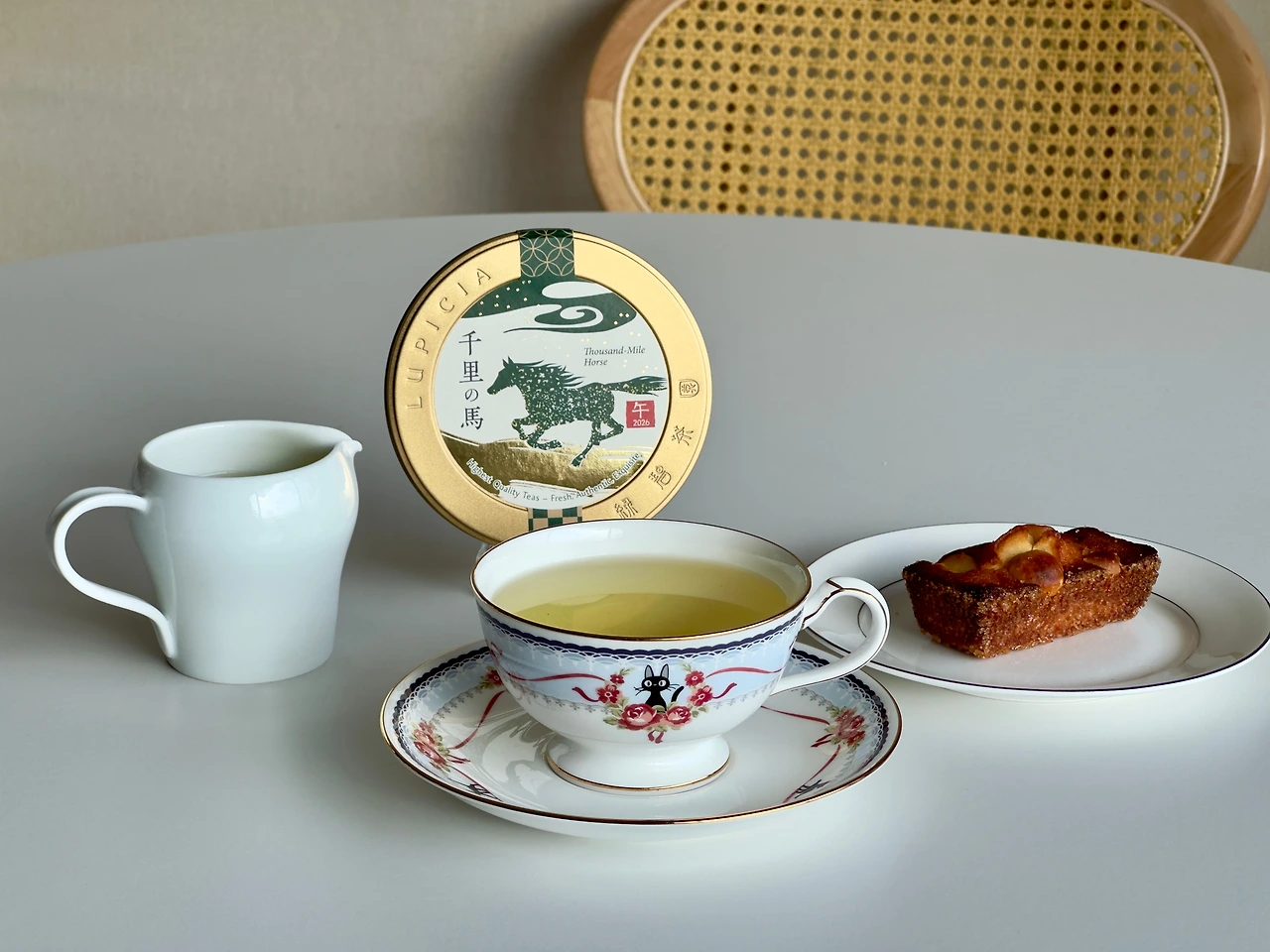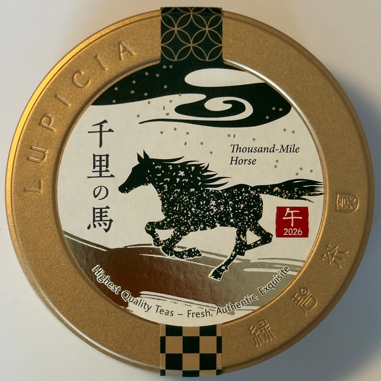 2026년 병오년, 말의 해를 맞아 루피시아에서 출시한 간지차 천리마. 천리를 달리는 명마처럼 새해에는 모든 일이 뜻대로 잘 풀리기를 바라는 마음을 담았다고 한다. 앞서 시음기를 작성한 마마후후와 함께 2026년 말의 해를 기념하는 차로, 마마후후가 홍차 베이스라면 이쪽은 녹차 베이스로 짝이 되는 블렌딩이다. 그렇다. 마마후후를 개봉했던 1월 초에 함께 개봉했고 지금은 이미 다 마신 차가 되어버렸다. 다행히 사진은 남겨두었기에 무리 없이 시음기를 작성할 수 있게 되었다. 50g 한정 디자인 금색 캔 1500엔으로 두 캔을 구입했고 상미기한은 제조일로부터 1년으로 좀 짧은 편이다. 캔 없이 봉입을 따로 안 팔아서 깡통값을 두 번 내야 하다니 너무도 큰 손해다.