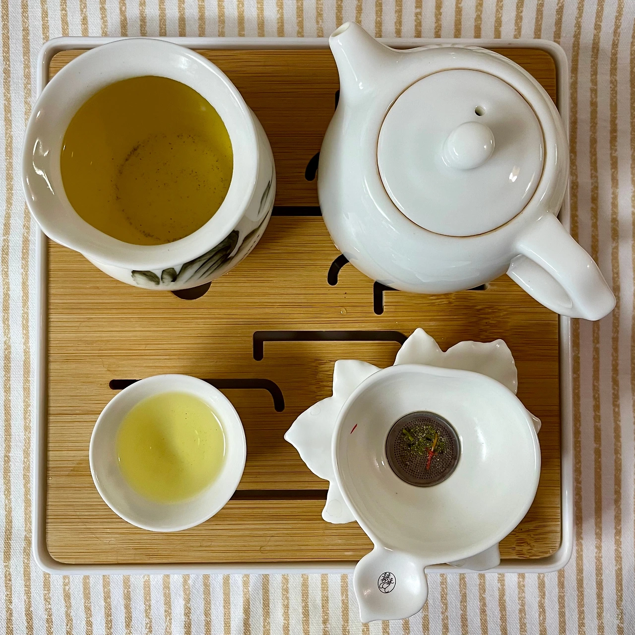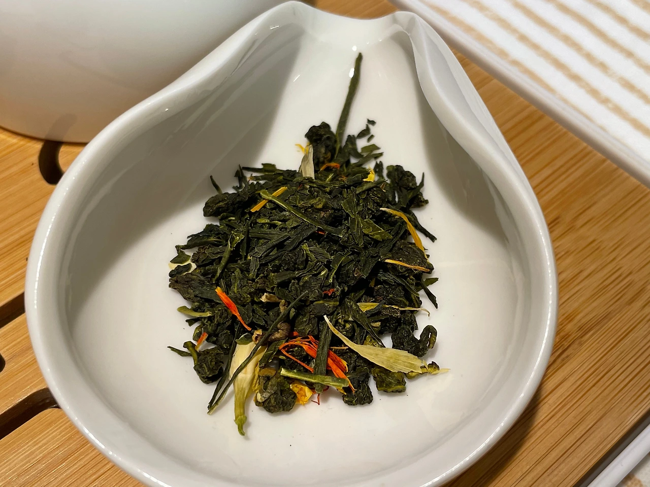 개봉해 보면 동글동글하게 말린 우롱차와 길쭉한 일본녹차가 들어있고 자스민꽃이 꽤나 푸짐하게 들어있다. 빨간 잇꽃도 보인다. 노랑노랑한 건 메리골드인 듯. 꽃들이 아주 화려한데 정작 향은 달큰한 과일 가향과 짙은 우롱차 향이 난다. 살구와 코코넛 가향이라고 하는데 라벨에 적혀있는 코코넛의 달콤한 향보다는 살구의 달콤함이 좀 더 강한 것 같다. 살구와 코코넛이 합쳐지니 묘하게 복숭아 가향 같기도 하고. 우롱차가 엄청 고급으로 보이진 않는데 의외로 향이 짙어서 내포성도 꽤 기대가 된다. 어떻게 마실까 하다가 80도에서 천천히 뽑아보기로 한다.
