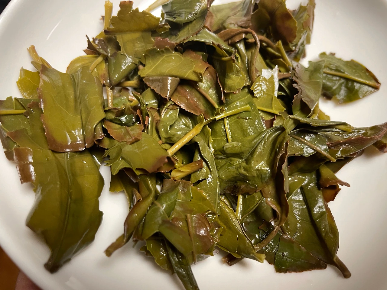 엽저의 특징이 아주 뚜렷한데 군데군데 저렇게 불에 그슬린 것처럼 빨간 부분들이 있다. 제일 궁금한 부분. 건조 전후에 한쪽방향만 엄청 발효(산화)시킨 건지 뭔지 모르겠다. 다른 미나미 사야카, 그러니까 우롱차나 센차 만든 엽저에도 간혹 저런 거 같던데 잎에 홍사선이 원래 있는 건지 볼 때마다 좀 신기한 부분이다.