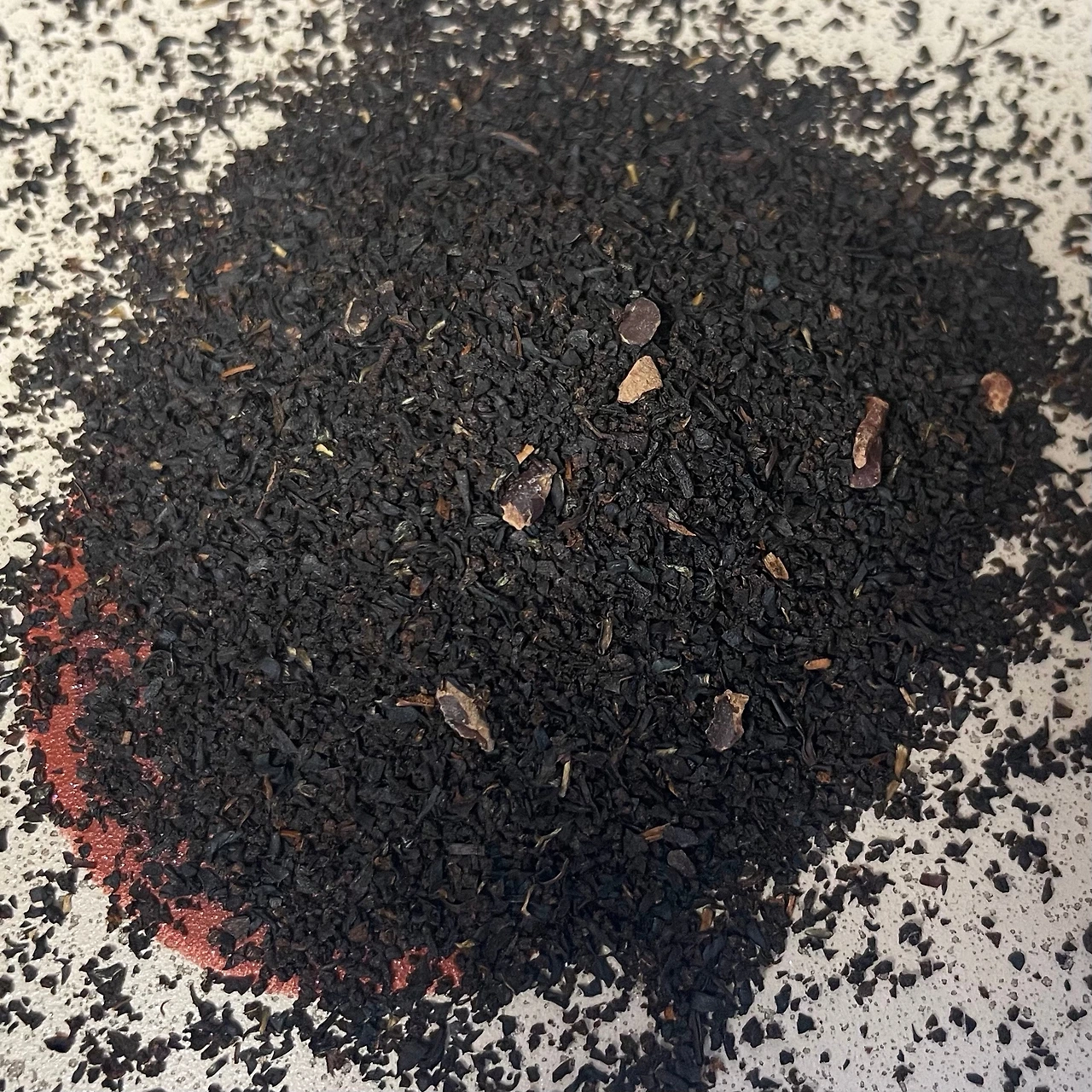 개봉하면서 나는 향은 달콤한 초코향이 메인으로 커피원두 고소한 냄새도 같이 난다. 정확히는 가나슈의 향이랄까. 누구나 맡아보면 ‘어 나 이거 알아’ 하면서도 이름을 대긴 어려운 그 향이다. 찻잎은 패닝급으로 동봉된 카드에도 1분 우리라고 나와있을 정도로 빠르고 진하게 우리는 걸 노린 찻잎이다. 설명엔 아쌈베이스라고 한다. 자세히 보면 카카오닙스도 조각으로 들어있는데 사진에 잘 안 보여서 로얄밀크티 한다고 밀크팬에 찻잎 넣었을 때 다시 찍었다. 가향이 진하게 들어간 편으로 티베이스가 걱정될 정도. 아쌈이 밀릴 것 같은 진한 가향이다.