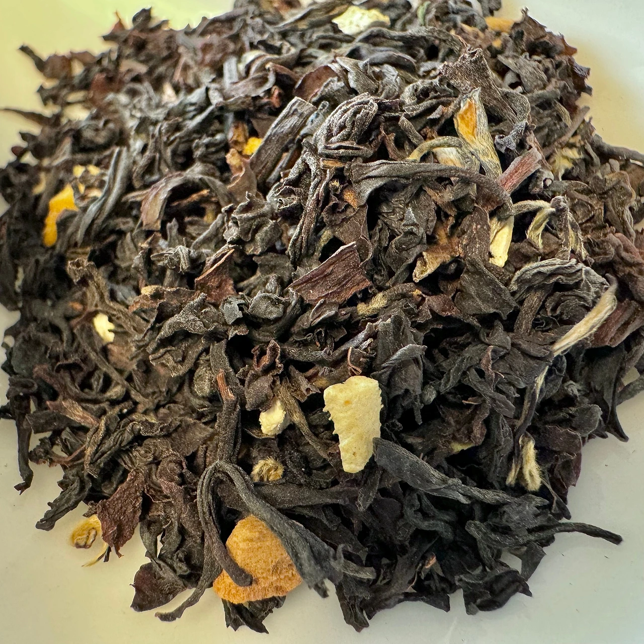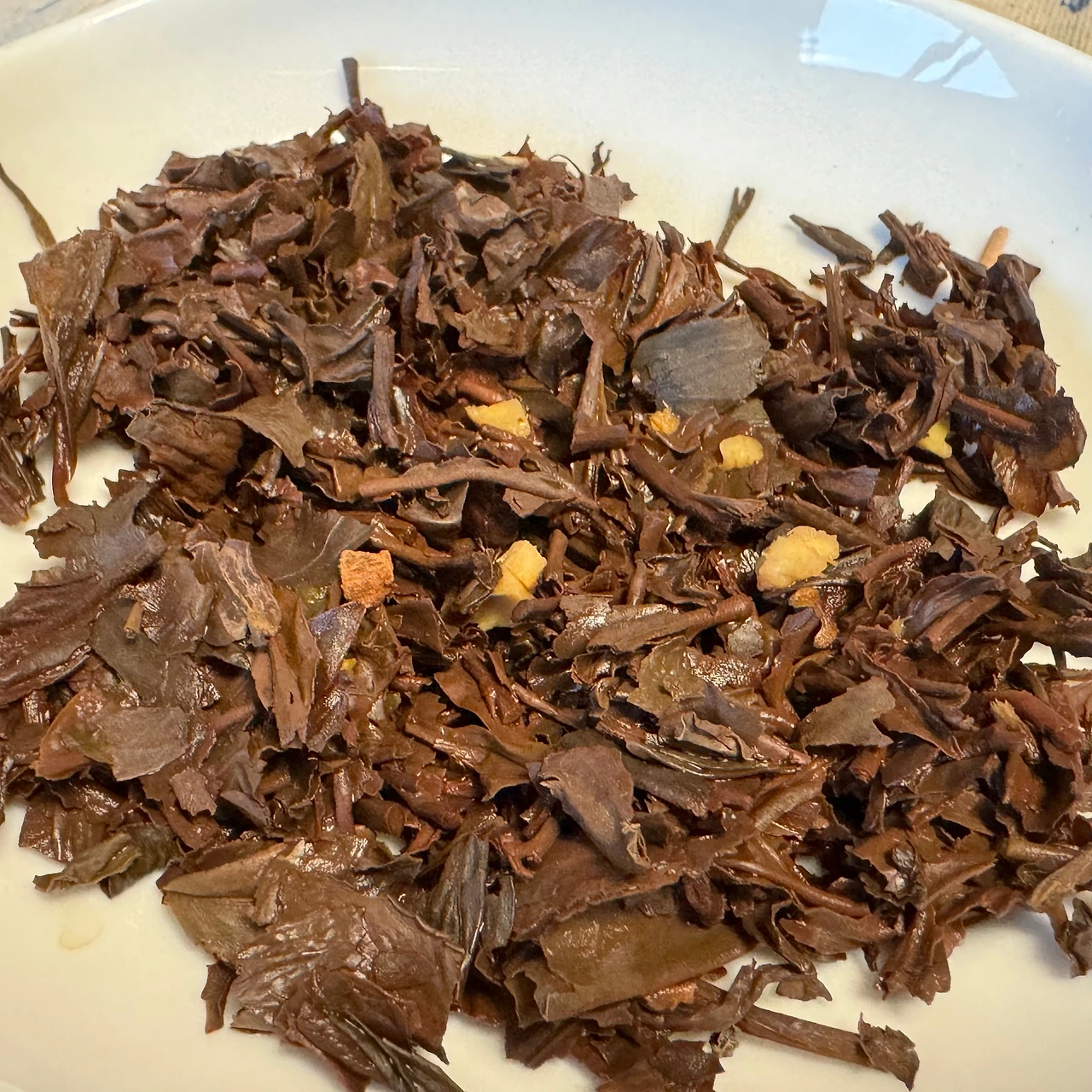 개봉해서 향을 맡아보니 시나몬과 정향이 달큰쌉싸름하다. 재미있는 건 확실히 톤이 확 다운되어서 뒤로 달아나는 향이다. 비슷한 향이었던 크리스마스 리스는 형신료들이 코로 날아와 박히는 굉장한 휘발성이었는데 오렌지 포맨더는 코로 빨아들이기가 한참 무거운 느낌이 있다. 건엽을 덜어내면 세컨 플러시 치고는 솜털이 아주 뽀송한 다즐링이 숭덩숭덩 썰려서 들어있다. 토핑에서 가장 많은 건 생강조각과 오렌지필이지만 시나몬도 꽤 들어있고 정향은 그리 많이 보이진 않는다. 나중에 엽저에서 찾아봐도 딱히 보이지는 않던데 줄기랑 착각을 했나 싶기도 하고. 아니면 정말 몇 개 들어있진 않은 것 같은데 그래도 향은 모든 팟에서 나긴 했으니 그것도 신기하다. 오렌지필이 시나몬보다 더 잘게 잘려있는 것도 재미있었다. 아마도 오렌지필을 더 강하게 우려내야 해서 그런 것 같다.