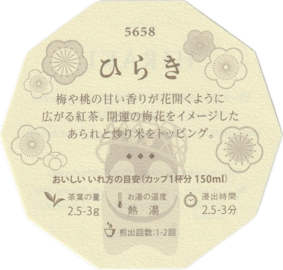 우메 야 모모 노 아마이 카오리 가 하나히라쿠 요 니 히로가루 코차. 카이운 노 바이카 오 이메지 시따 아라레 또 이리고메 오 토핑그.