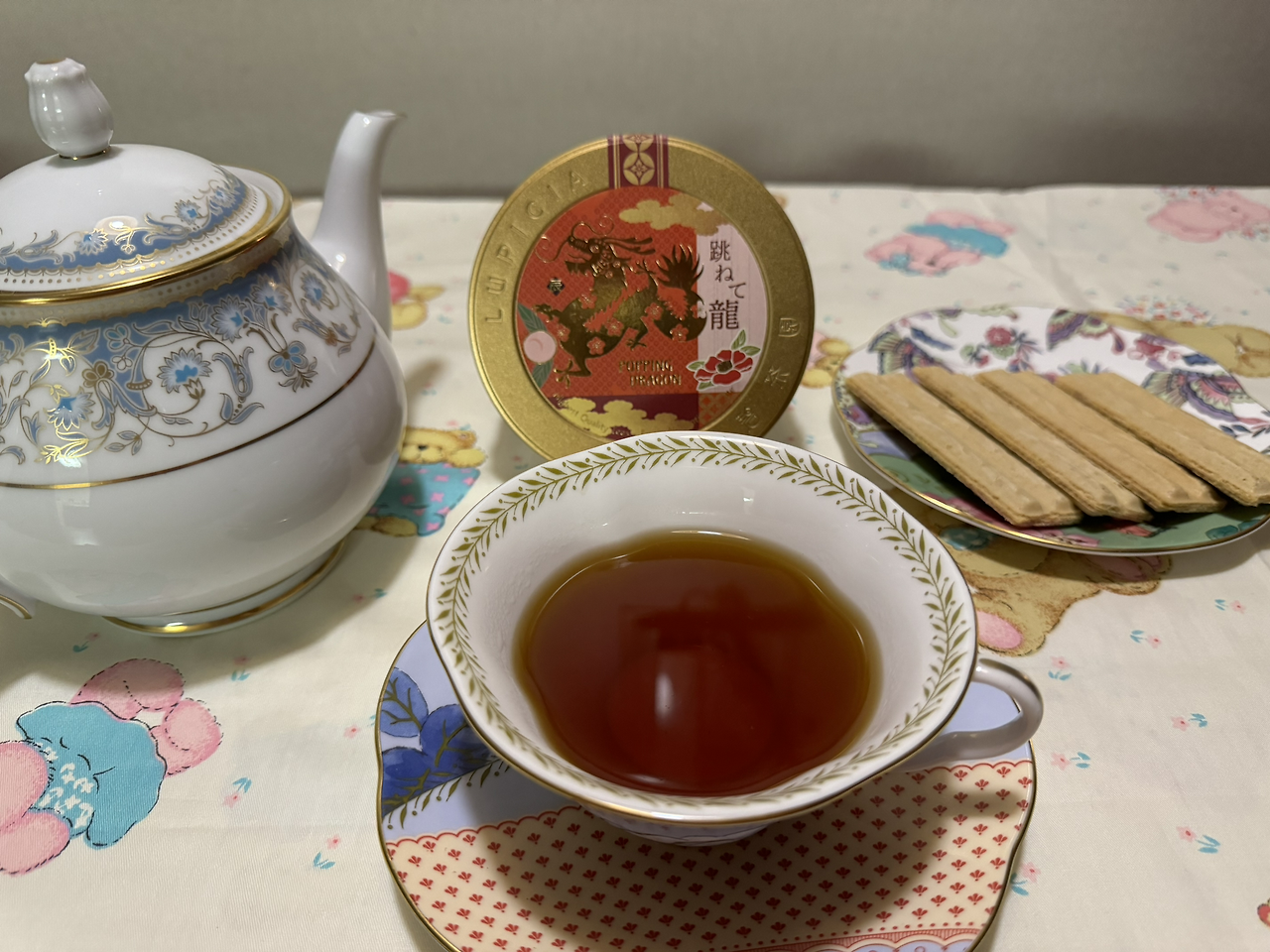 루피시아의 2024년도 용의 해 한정차인 하네테류, 일명 튀어용을 마셔보았다. 작년 연말에 간지차 나오자마자 구매해서 보부상님께 전달받은 차인데 이제서야 마셔보는 건 아니고 진즉에 다 마시고 시음기가 늦었다. 자세한 이야기는 뒤에 하기로 하고 우선은 시음기를 이어가 보자. 지난번 날아용이 날아오르는 용을 이미지 한 우롱차 베이스의 가향차였다면 이번 튀어용은 퐁퐁 튀어 오르는 용의 이미지로 홍차 베이스의 가향차이다. 녹차홍차 세트면 뭐다? 일단 사고 보는 거다, 그것도 세투세투로. 그렇게 구입하게 된 튀어용. 이제 구매사유를 지어내는 것도 슬슬 한계에 도달하는 것 같다. 솔직히 그냥 거기 신차가 있었기 때문에 산겁니다. 한정 일러 캔입이고 50g에 1350엔, 상미기한 2년이다. 2월 초에 이미 매진이었으니까 인기가 꽤 좋았던 것 같다.