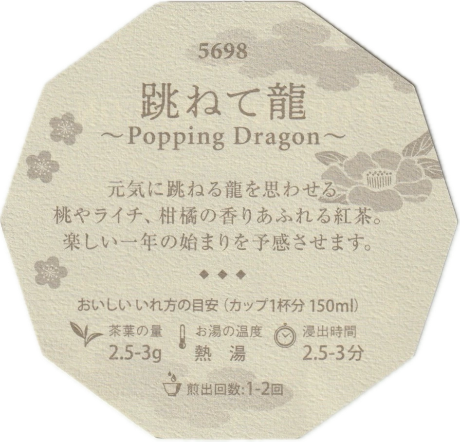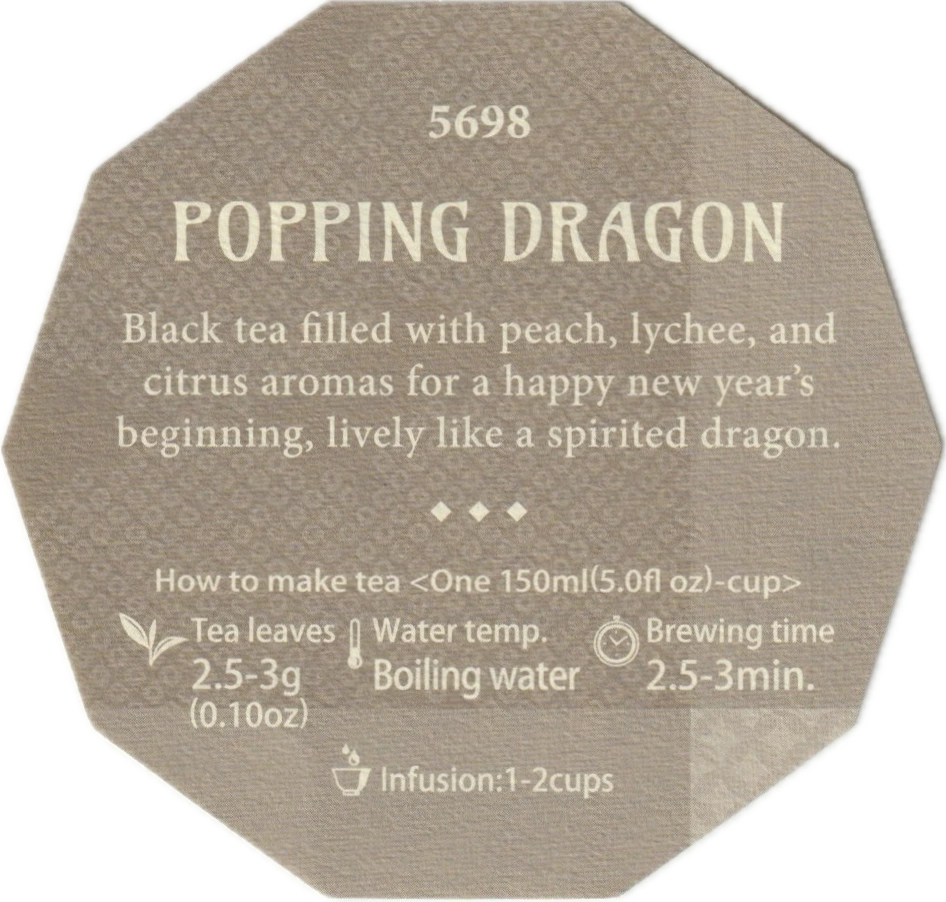 활기찬 용이 뛰어오르는 모습을 떠올리게 한다. 복숭아, 리치, 감귤 향이 가득한 홍차. 즐거운 일 년의 시작을 예감하게 한다.