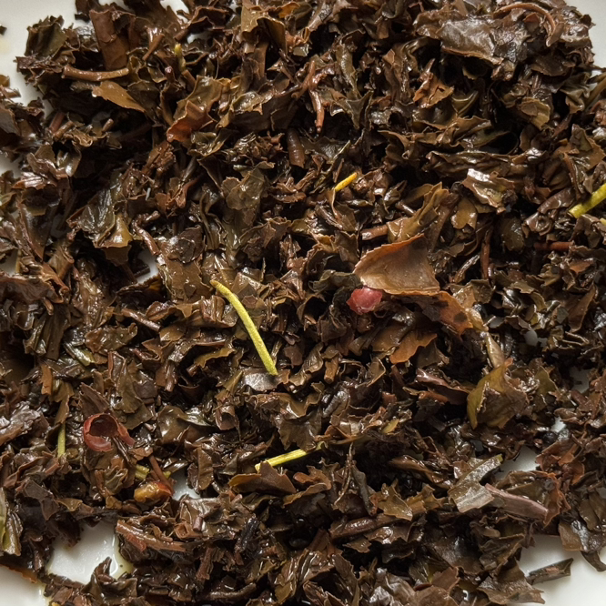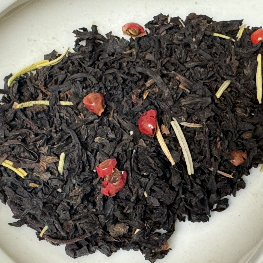 봉지를 개봉하면 가스를 들이키는 듯한 강한 휘발향과 함께 솔잎향 같은 향이 강하게 날아든다. 역시 사쿠람보 하면 이 향이지. 사쿠람보를 단순히 체리라고 번역하기 어려운 이유이기도 하다. 그렇다고 버찌향이 이렇지도 않겠지만. 아무튼 이 상쾌한 향이 사쿠람보의 핵심이라고 할 수 있겠다. 건엽을 덜어내면 이제서야 보이는 핑크페퍼와 녹색의 로즈마리. 버찌의 열매와 거기 달린 꼭지를 표현한 토핑일텐데 이제와 생각해 보면 각각의 향이 정확하게 블랜딩 되어있지만 아무것도 모르고 정보를 접하기 어렵던 그 옛날엔 실제 버찌열매와 솔잎인 줄만 알았다. 로즈마리를 안 먹던 때도 아닌데 왜 그랬는지, 아마도 부족한 상상력 때문이겠지. 아까부터 이야기한 솔잎향의 정체도 바로 이 로즈마리향인데 로즈마리인걸 알고 맡으면 영락없는 로즈마리가 맞다. 다만 가향의 그 휘발향과 섞여서 좀 매콤해지니 헷갈리기도 쉽다. 베이스 홍차는 적당히 인도와 베트남을 섞은 블랜딩.