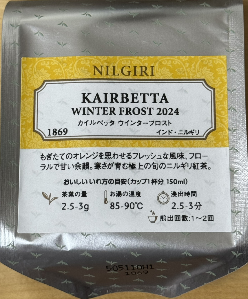 작년 이맘때 보부상님을 통해 얻어보려 하였으나 실패했던 물건이 있었으니 바로 닐기리 윈터프로스트. 인도의 주요 차 생산지인 아쌈과 다즐링이 북쪽이라면 남인도에는 닐기리라는 지역이 주요 차 생산지로 유명하다. 예전엔 닐기리라고 하면 뭔가 마니악한 느낌이 있었는데 요즘은 싱글 이스테이트 중심으로 고급화가 많이 된 느낌이다. 아무래도 남인도라서 그런지 여기도 한겨울이 첫물차의 느낌인데 다즐링으로 따지자면 퍼스트 플러시가 닐기리에선 윈터가 되시겠다. 평소에도 닐기리를 즐겨 마시는 터라 작년에 너무 늦게 구매를 시도하게 못내 아쉬웠는데 올해는 일정이 어떻게 잘 맞아서 구해왔다. (매장에서 판매 중인 닐기리 햇차는 하나씩 다 구해오긴 했다.) 카일베타 다원은 앞서 말한 닐기리 고급화에 앞장서는 다원 중 하나로 오소독스한 방법을 통해 닐기리 홍차를 생산 중인 다원이다. 아쌈과 마찬가지로, 아니 어쩌면 더 많은 비율로 닐기리는 기계를 통해 CTC나 더스트 형태로 만들어져 티백 내지는 블랜딩에 쓰곤 하는데 예전엔 아쌈도 아닌 것이 실론도 아니다 싶으면 닐기리였을 정도로 흔하게 쓰이다가 최근엔 카일베타 같은 다원 중심으로 닐기리 자체의 고급진 맛을 포지셔닝하는 경우가 더 많아진 것 같다. 아무튼 그래서 고오오오급 닐기리 50g 봉입으로 무려 2000엔, 상미기한은 2년짜리를 구매 완료.