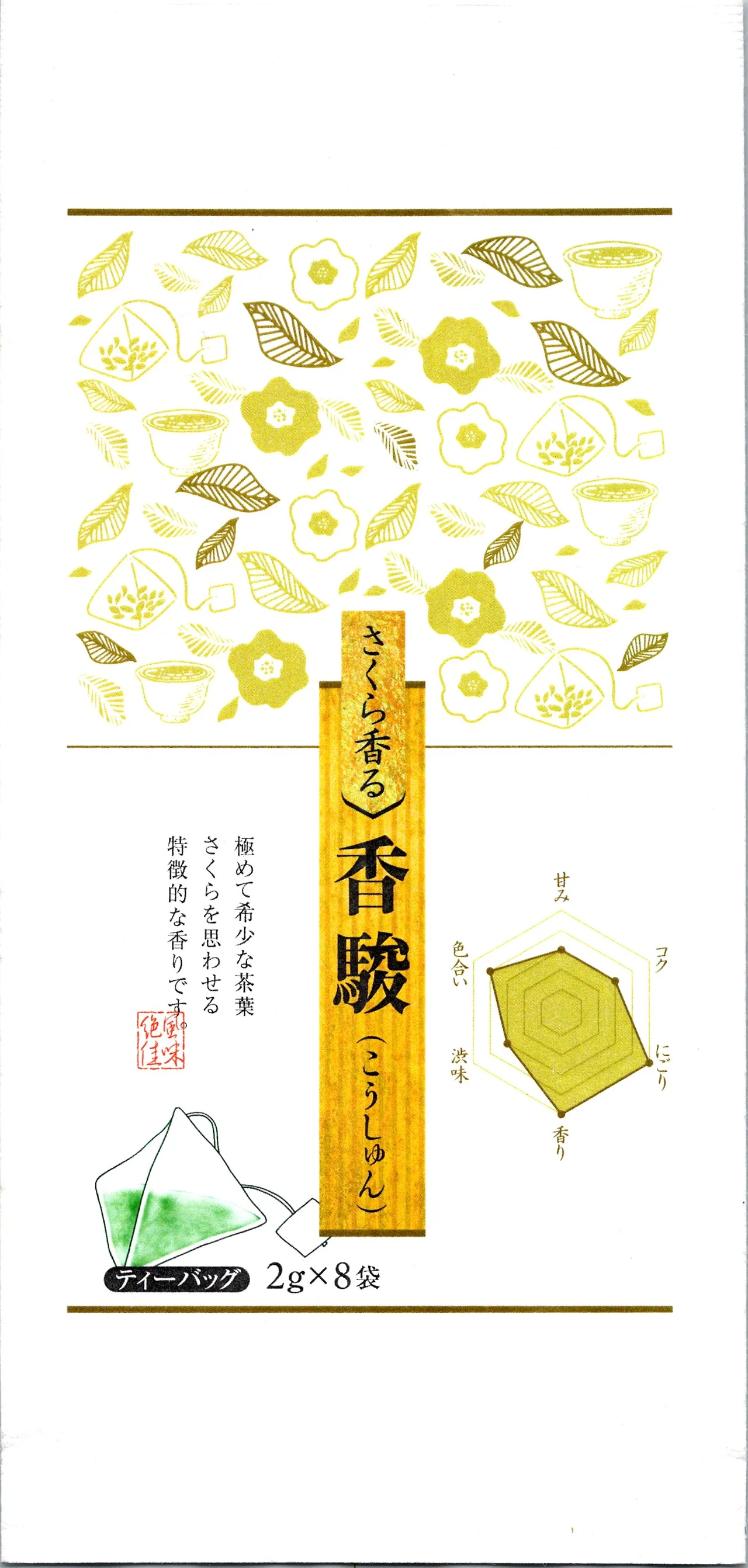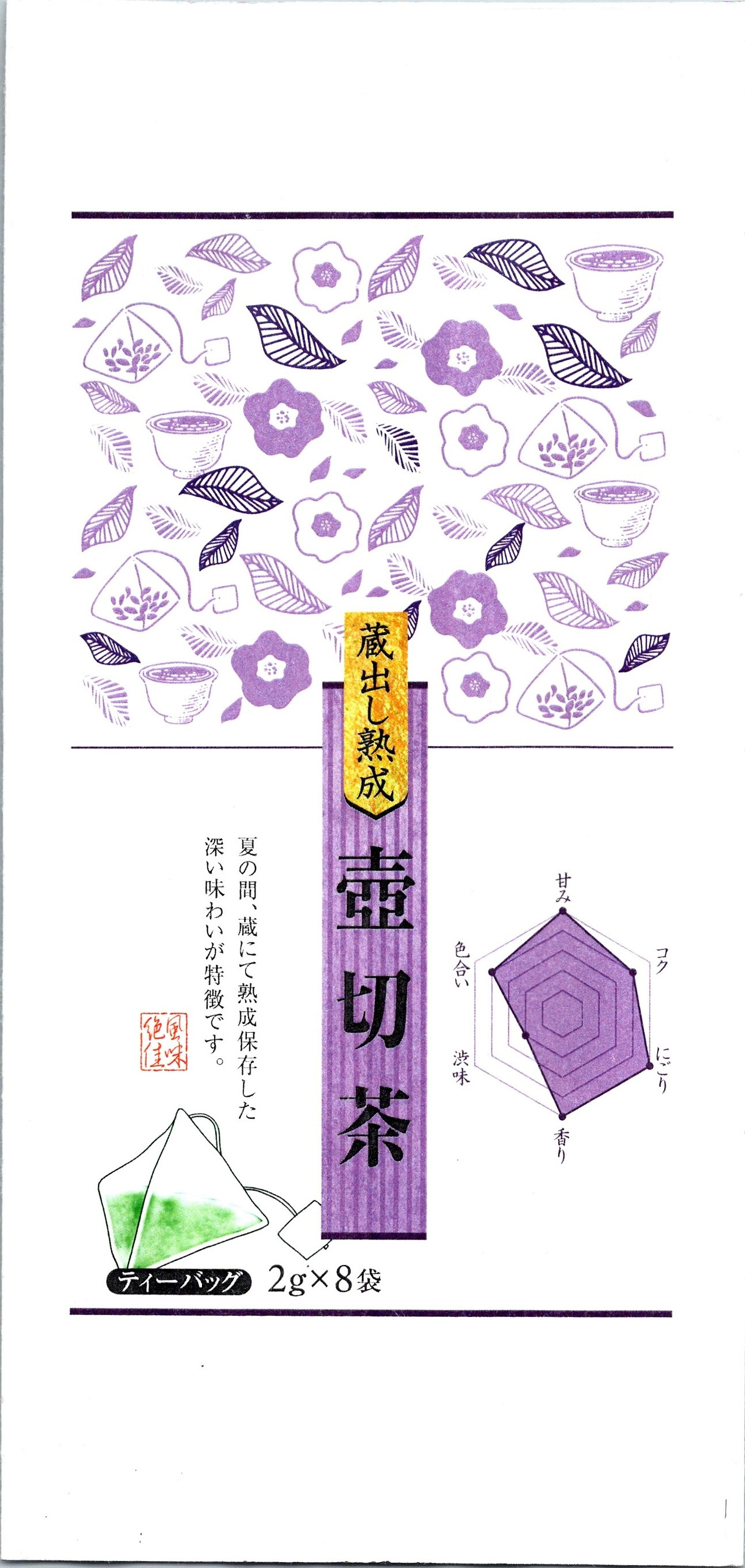나중에 마시면서 천천히 찾아보니 하리마야 다호라는 곳에서 만든 차인 듯하다. 하리마야라는 찻가게가 어딘가 봤더니 히메지라고 오사카의 서쪽, 그러니까 고베도 훨씬 지나서 있는 동네에 있는 가게이다. 공홈에서 같은 차를 찾진 못했는데 아마도 마트 출품용으로 만든 상품인가 보다. 그 마트에는 이 시리즈가 두 종류가 있었는데 육각형을 보면 알겠지만 하나는 맛이 좋고 하나는 향이 좋다. 보라색이 맛이 좋은 츠보키리차, 노란색이 향이 좋은 고준. 고준은 한자 자체가 향이 준수하다는 한자로 꽃과 같은 향이라고 적힌 듯하다.
