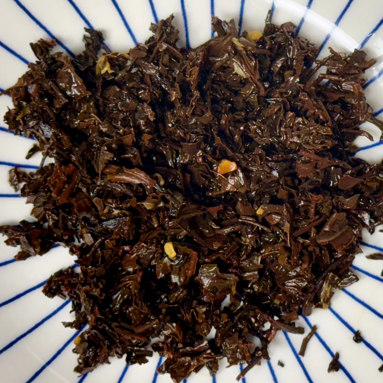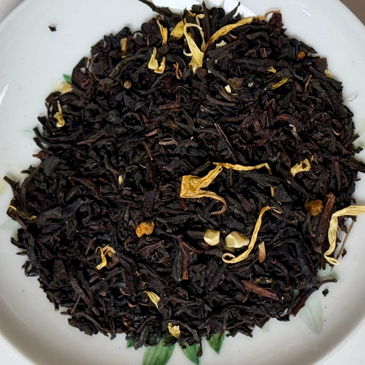눈 덮인 고원에 웅장하게 서있는 대리석 궁전 같은 이미지의 꿀과 아몬드향의 홍차라고 한다. 겨울궁전 이름 그대로 굉장히 겨울겨울한 향이라고 느꼈었는데 어딘가 고급지고 신비로우면서 어? 이거 아는 건데? 싶은 향으로 기억한다. 시간이 많이 흘러 지금은 어떤 향일지 소분봉투를 열어본다. 뭔가 살짝 찌르는 냄새가 나는데 이게 뭘까. 이거 정말 아는 향인데. 며칠을 지나서야 깨달았다. 아 맞다, 이것은 내 목젖을 적셔주던 바로 그 프로폴리스의 향. 포레스트 허니라고 해서 그게 뭔가 했더니 아마도 야생꿀, 프로폴리스 느낌의 꿀인가 보다. 그렇다고 해도 뭔가 더 새콤한 향이 있는데 이게 뭘까 했더니 인공 체리향. 뜬금없이 체리향이 여기서 왜 나는 거지 싶은데 아마도 설산의 나무들 사이에서 빨간 열매가 눈송이 사이로 열려있는 이미지를 생각한 건가 싶다. 약간은 쌉싸름하면서 은은하게 단 향기가 고급스러운 이미지를 떠올리게 한다. 건엽을 덜어보니 메리골드와 밤 조각, 아몬드 조각등이 보인다. 오히려 일반적인 꿀향이 떠오르는 모습인데 체리 프로폴리스라니. 굉장히 색다르다.