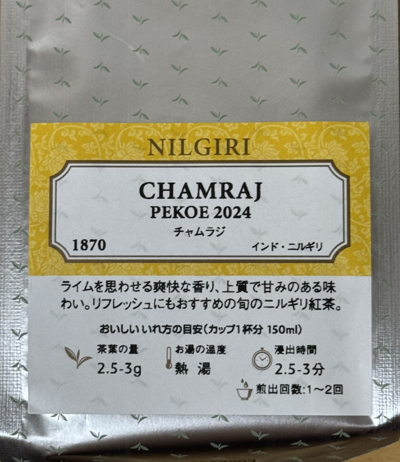 닐기리 시리즈를 사 온 지가 너무 오래되었는데 시음기가 뜸해서 혹시 기다리신 분이 계신가요. 그럴리는 없겠지만 혹시라도 궁금함을 견디고 계신 분들이 계실까 봐 다 마신 지 두 달이 넘는 기억도 가물가물한 닐기리 참라지 시음기를 마저 써본다. 그냥 지우자니 이미 써놓은 메모들이 많아서 마무리를 해보는 걸로. 참라지 다원의 닐기리 햇차가 무려 페코등급인데 50g 봉입으로 딱 1000엔이다. 상미기한은 넉넉히 제조일로 2년.