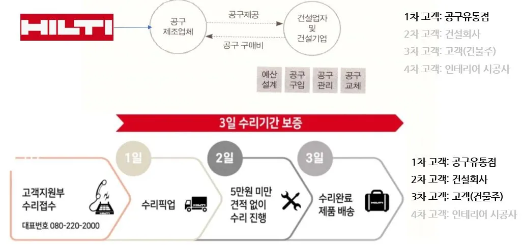 유럽 약소국 공구회사 힐티(Hilti)는 비즈니스 모델 혁신에 성공하면서 글로벌 건축 설루션 회사로 성장한 대표적인 사례다. 힐티가 비즈니스 모델에 성공할 수 밖에 없던 배경은 고객의 재정의에서 시작되었다. 이미 알려진 고객(공구 유통점)이 아닌 건설회사 및 고객(건물주) 입장에서 필요한 고객가치를 발견함으로써 '상품 판매 중심'의 비즈니스 모델에서 '공구 대여 및 관리 서비스'라는 업계에 한 번도 시도하지 않았던 새로운 비즈니스 모델을 생각할 수 있었다.